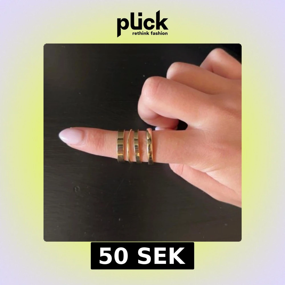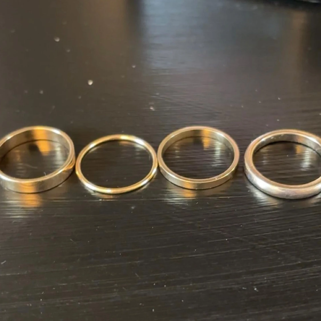 Säljer ett set med fyra minimalistiska guldfärgade ringar i olika tjocklekar. Ringarna har en enkel och clean design, perfekta att bära tillsammans eller var för sig för en snygg layering-effekt. Passar dig som gillar klassiska smycken med modern touch. Storlekarna skiljer mellan 17 och 18,5 mm tror jag