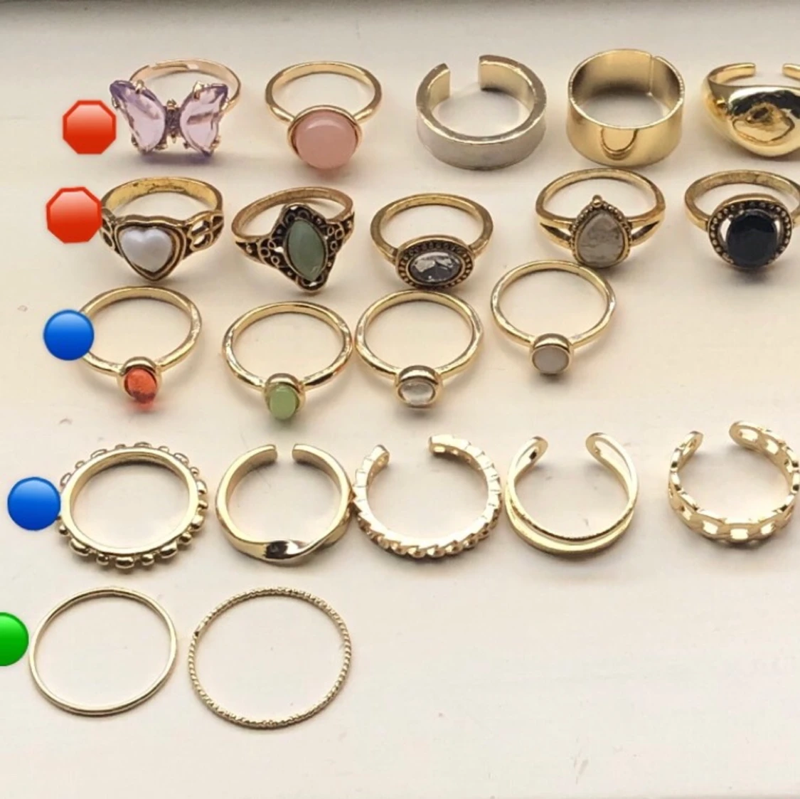 🛑20kr/st 🔵 15kr/st 🟢 10kr/st Frakt på 15kr tillkommer Ta helst en screenshot och ringa in den ring du är intresserad av och skicka ett meddelande vid frågor eller funderingar! Kan såklart fixa paketpris vid köp av flera ringar! 🦋Säljer även andra smycken så ta gärna en titt🦋