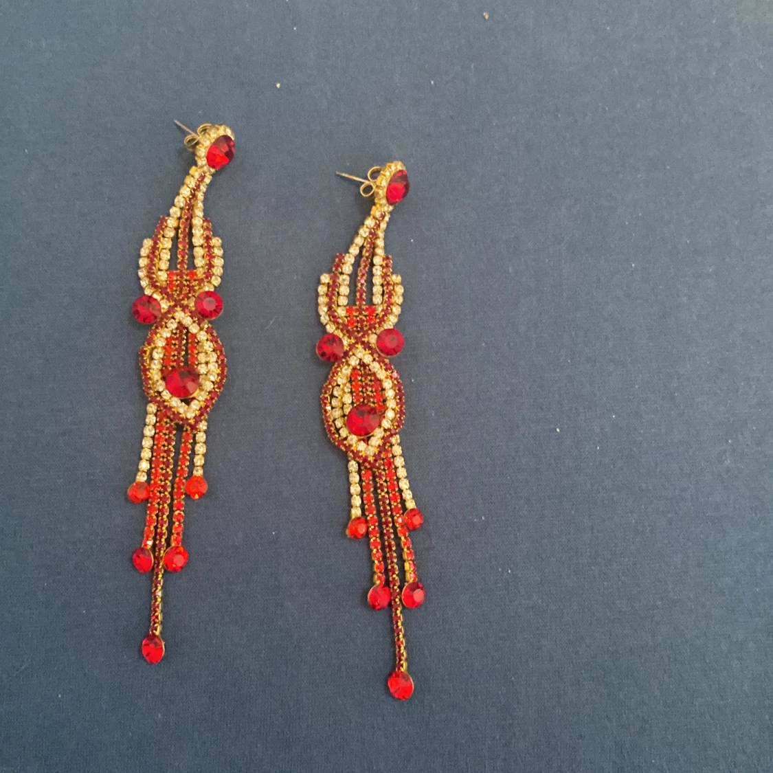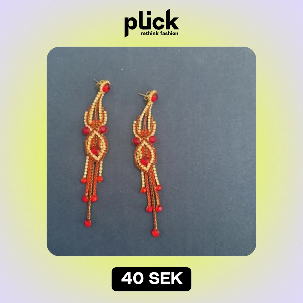 Säljer ett par eleganta och glittriga örhängen i guld och rött. De har en vacker, böljande design med små röda pärlor som hänger ner i flera nivåer. Perfekta för en fest eller en speciell kväll! ✨