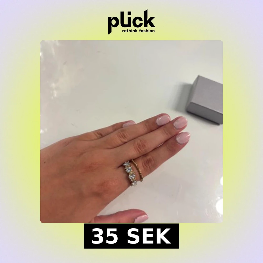 Två snygga ringar i guldton, ena med glittrande droppformade stenar och den andra med en tunn, pärlad design. Osäker på storlek men ca 18mm.