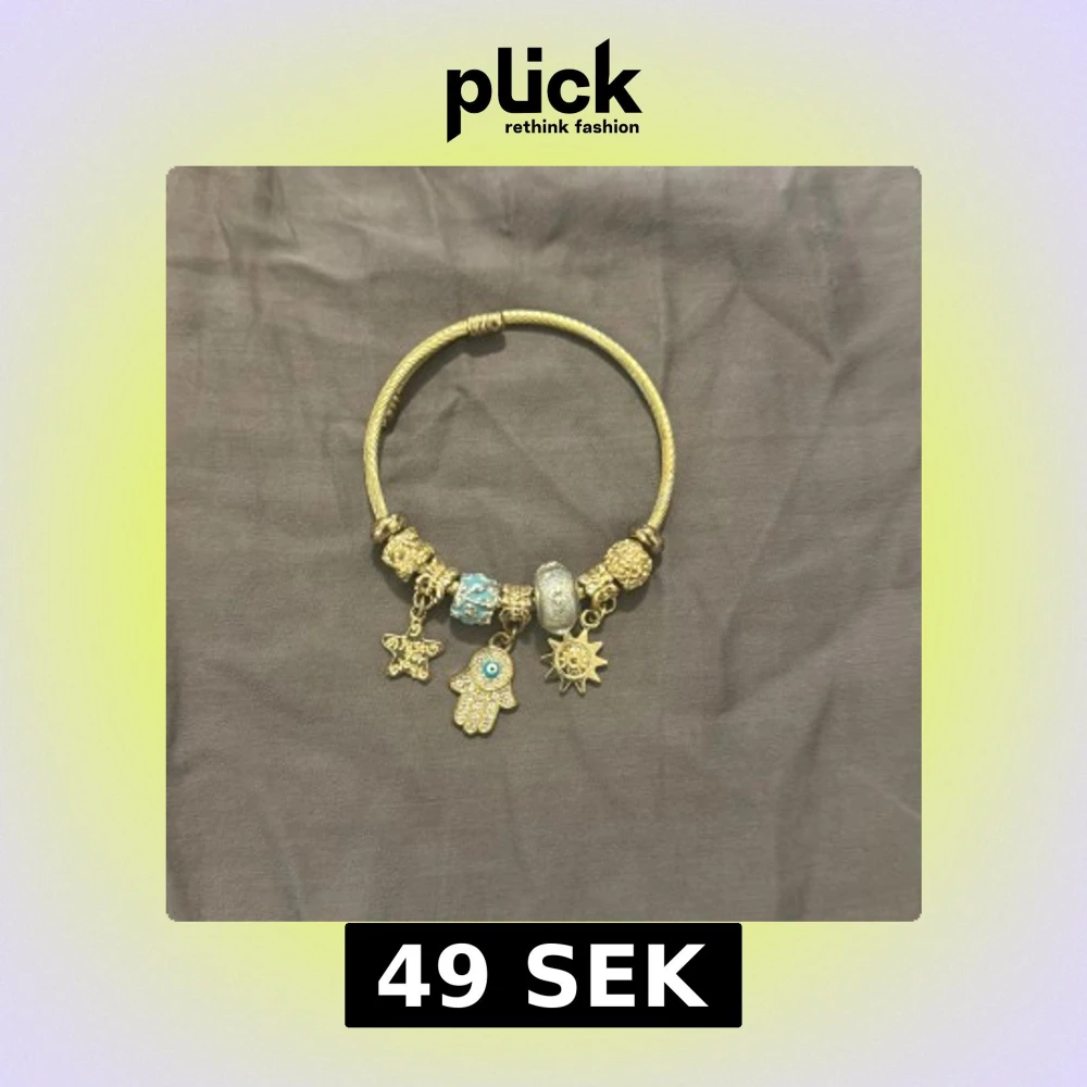 Snyggt guldarmband med flera berlocker, inklusive en hand med blå detalj, en stjärna och en fjäril. Armbandet har även glittriga och mönstrade pärlor som ger en unik look. Den är från Shein!!