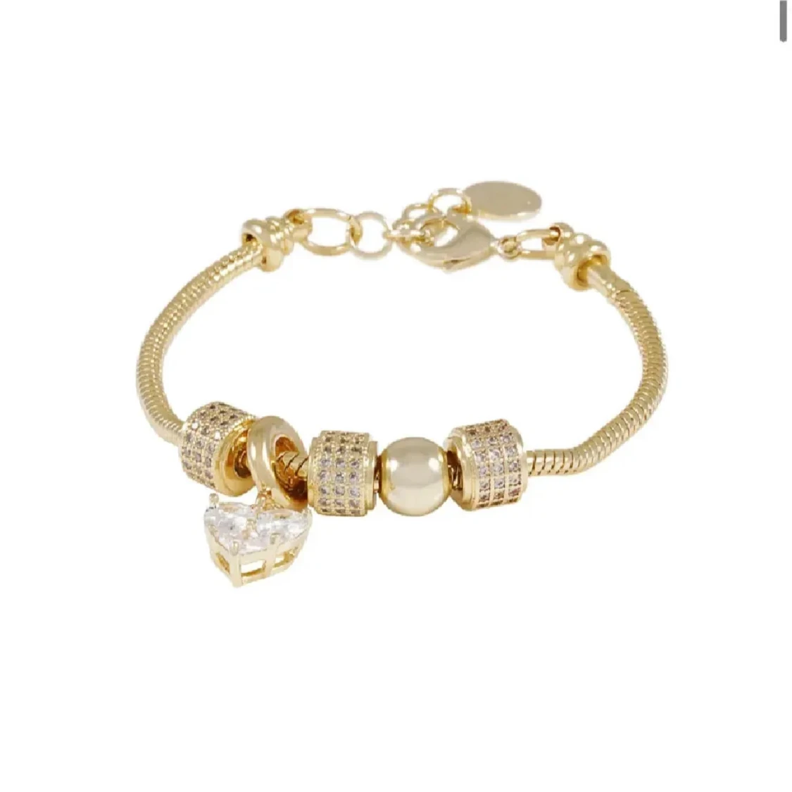 Snyggt guldarmband från SNÖ med flera glittriga pärlor och ett stort hjärtformat hänge i kristall. Armbandet har ormkedja och detaljer i guldton, samt en rund pärla i mitten. Perfekt för dig som gillar bling och unika detaljer.