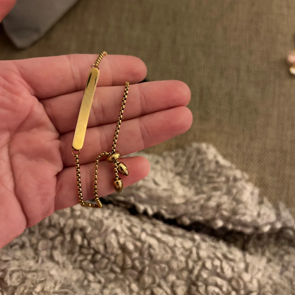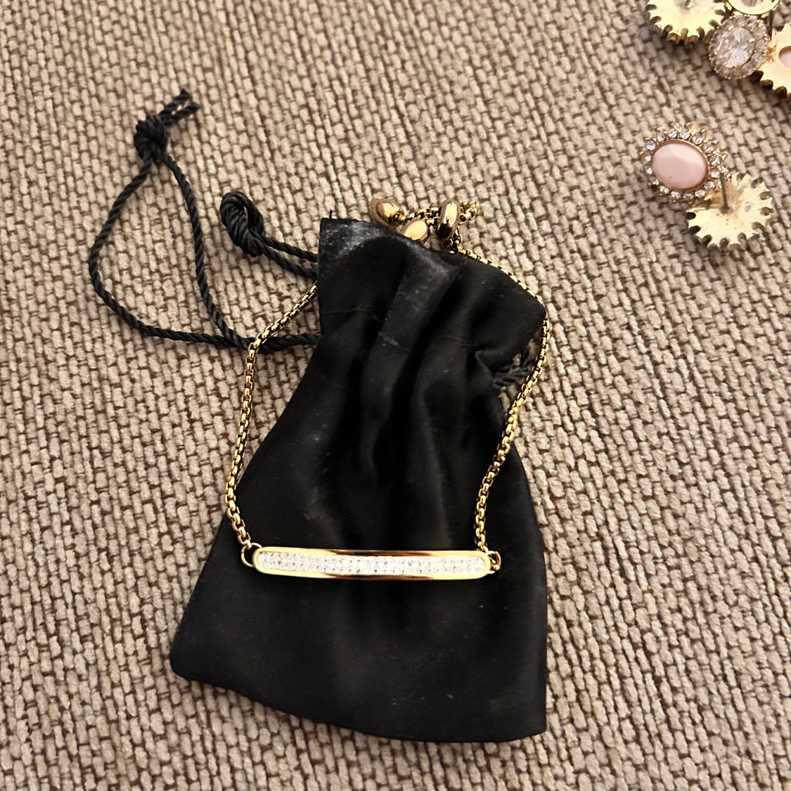 Snyggt guldarmband med en glittrig rektangulär detalj. Perfekt för att ge lite extra bling till din outfit. Armbandet har en justerbar kedja och kommer med en svart förvaringspåse. Passar både till vardag och fest!