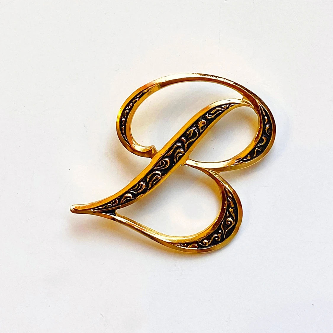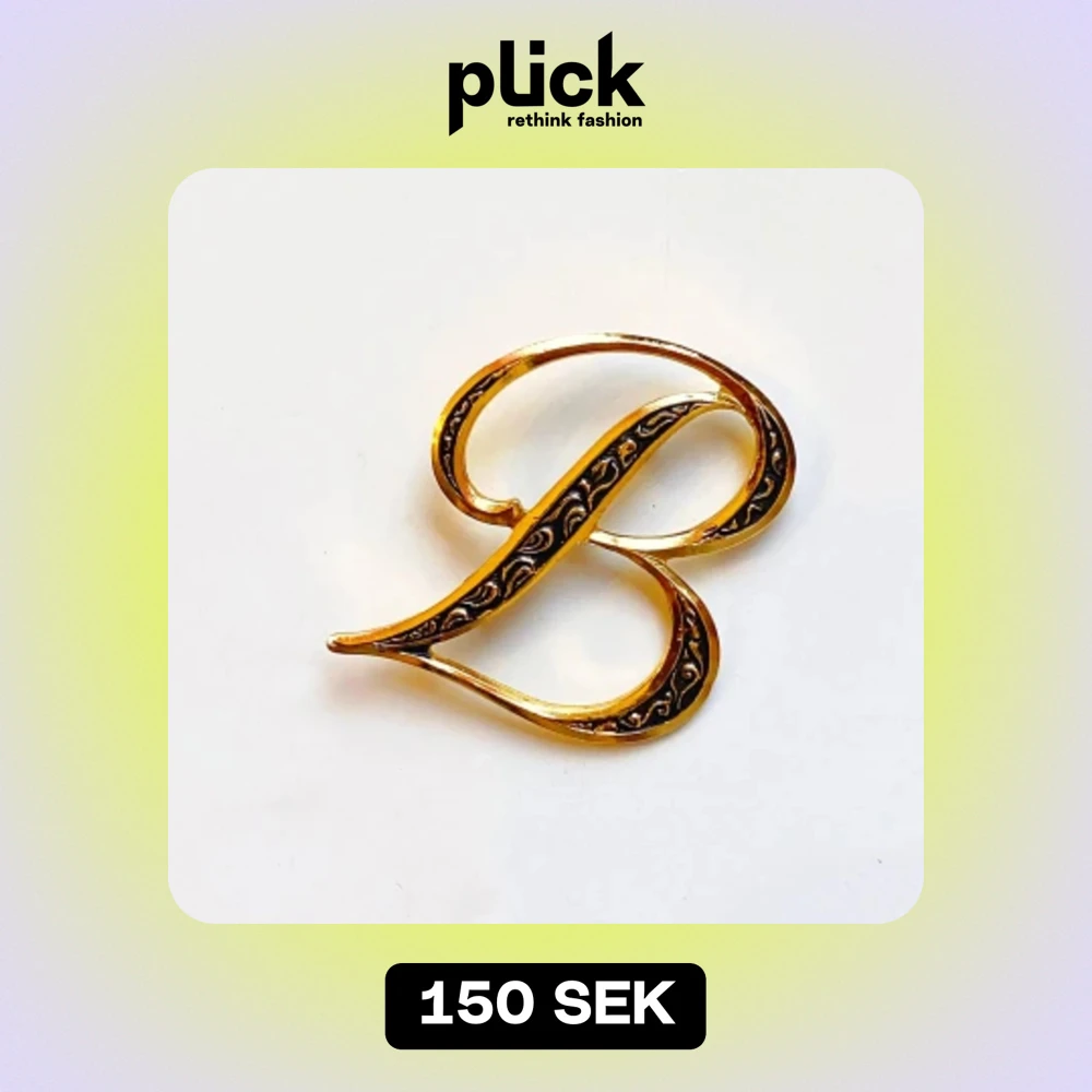 Snygg guldfärgad brosch formad som bokstaven B med fina detaljer. Perfekt för att piffa upp en outfit till fest eller vardag. Den är cirka 5 cm lång och har en säkerhetsnål på baksidan för enkel fastsättning.
