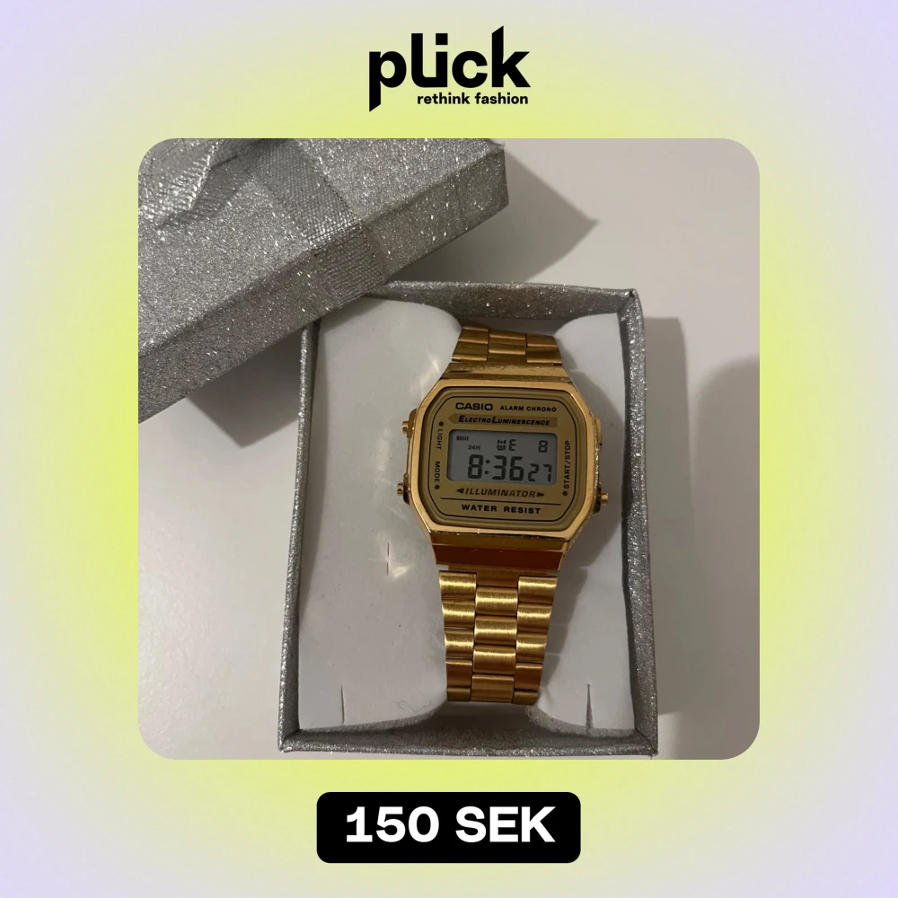 Säljer en snygg guldfärgad digital klocka från Casio. Den har en klassisk design med en fyrkantig urtavla och en länkarmband i metall. Klockan har funktioner som alarm, kronograf och belysning. Perfekt för både vardag och fest! 💛