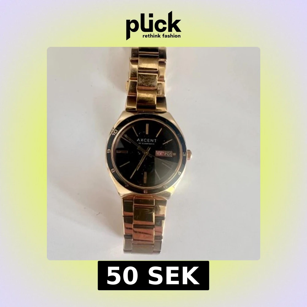 Stilren klocka från Axcent med guldfärgad länk och svart urtavla. Klockan har dag- och datumvisning samt tydliga indexmarkeringar. Perfekt accessoar för dig som gillar klassisk design. Använt skick