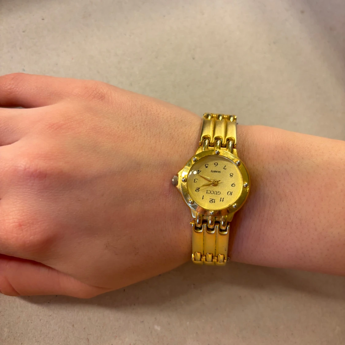 Säljer en elegant guldfärgad klocka från Gucci. Klockan har en rund urtavla med tydliga siffror och ett stilrent armband i metall. Perfekt för både vardag och fest. Den är i mycket bra skick och ger en lyxig känsla på handleden. Använd 1 gång!