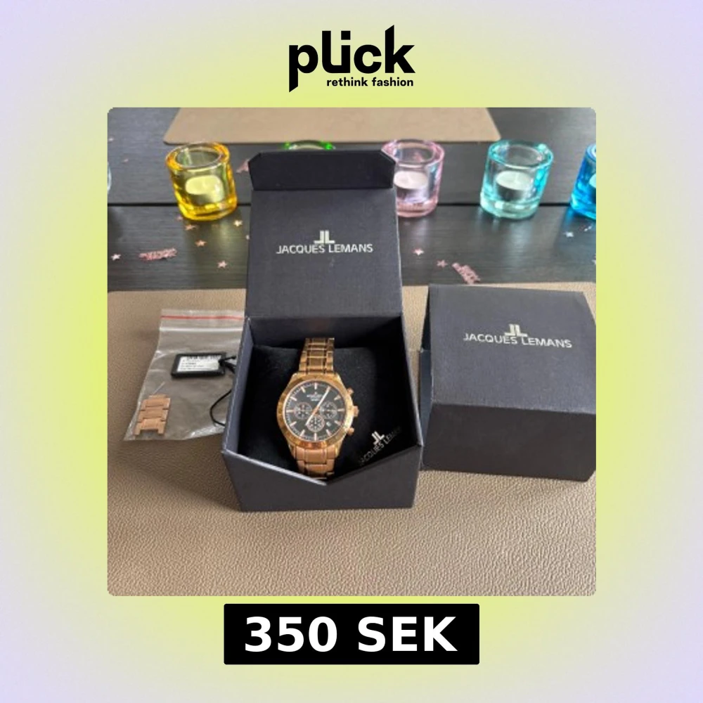 Säljer en stilren guldfärgad klocka från Jacques Lemans med svart urtavla och flera små urtavlor för extra funktioner. Klockan har en metallarmband och är vattenresistent. Perfekt för den som vill ha en elegant och utstickande accessoar. För tillfället så har klockan inget batteri i sig
