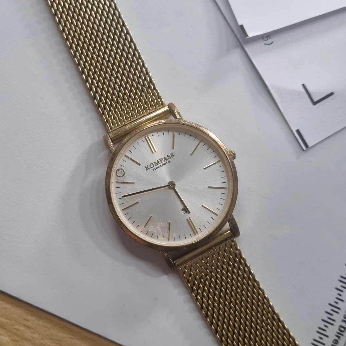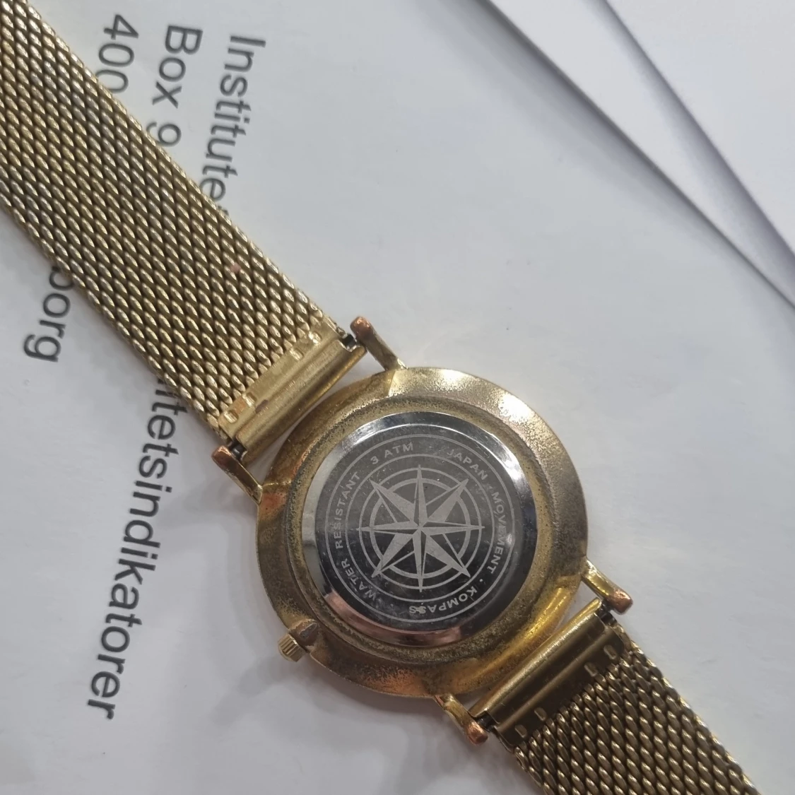 Stilren klocka från Kompass med guldfärgat mesharmband i rostfritt stål och vit urtavla. Klockan har minimalistisk design med tunna visare och index. Baksidan är graverad med kompassros och information om vattentäthet (3 ATM).