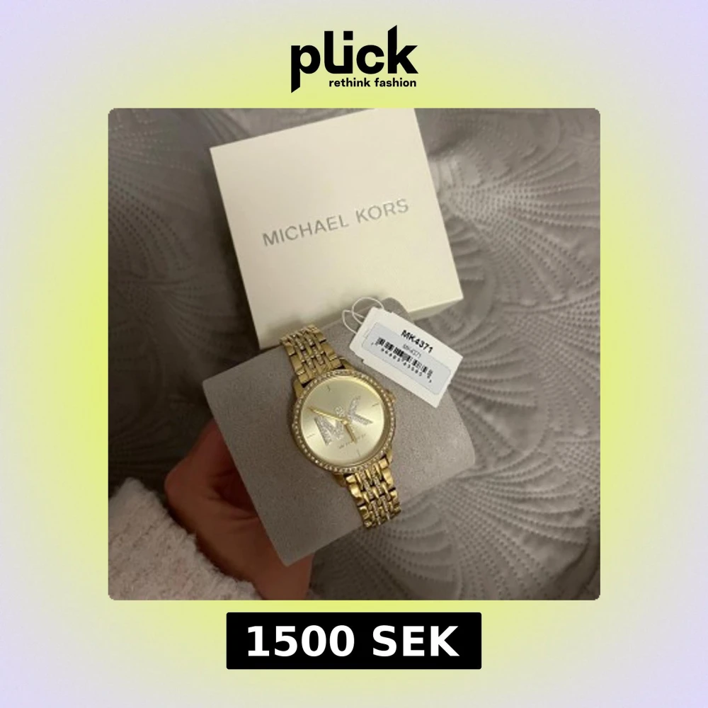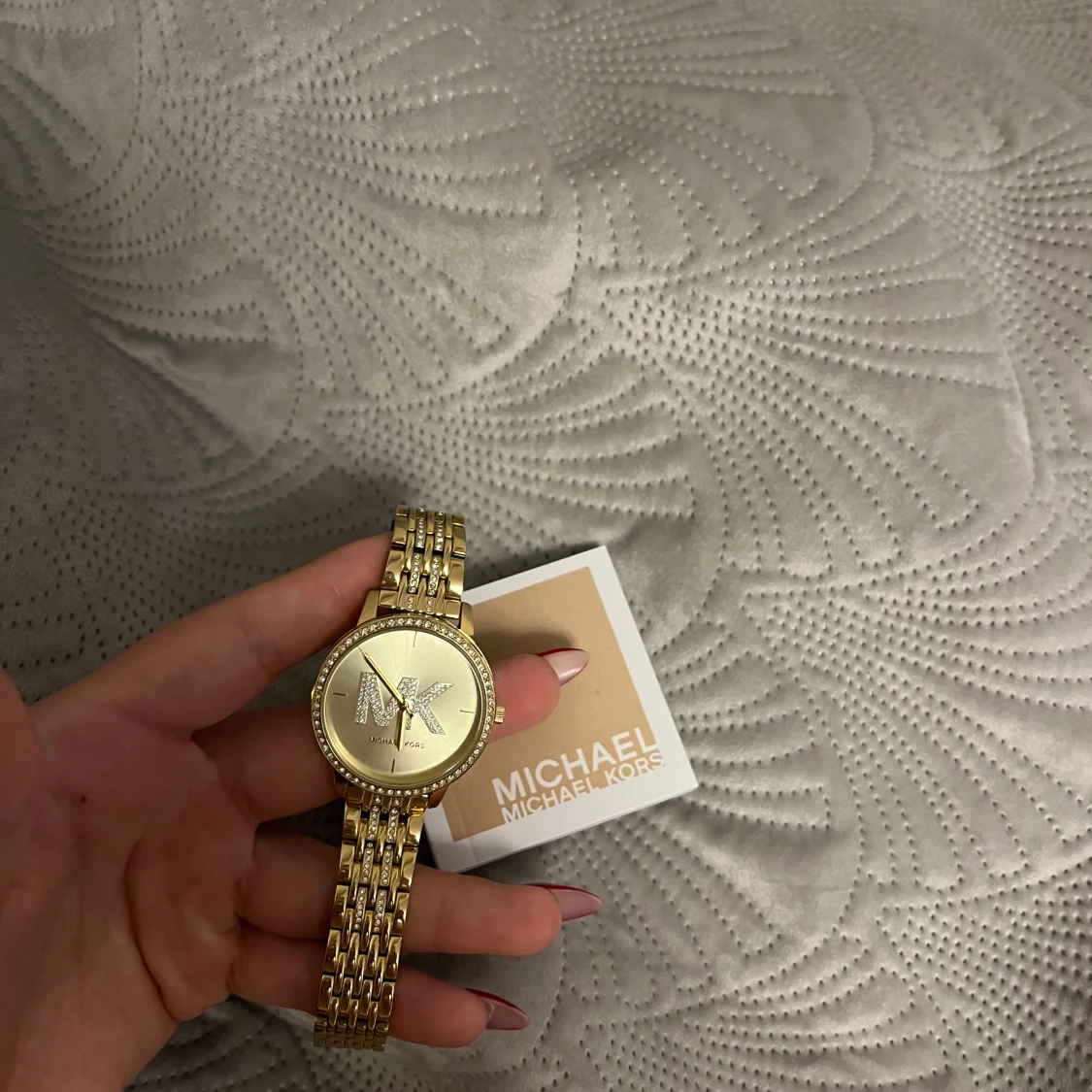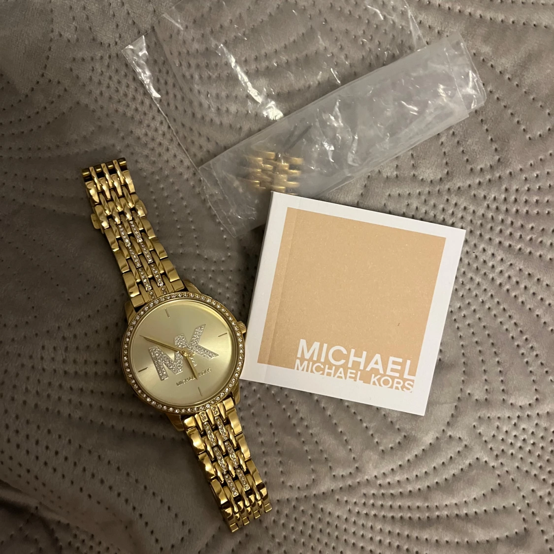 Snygg guldfärgad klocka från Michael Kors med glittriga detaljer runt urtavlan och ett stort MK-emblem. Använd 1-2 gånger, superbra skick inga repor eller liknande. Boks, lappar och länk för att förlänga den finns kvar. Batteriet måste bytas. Köpt för 3800