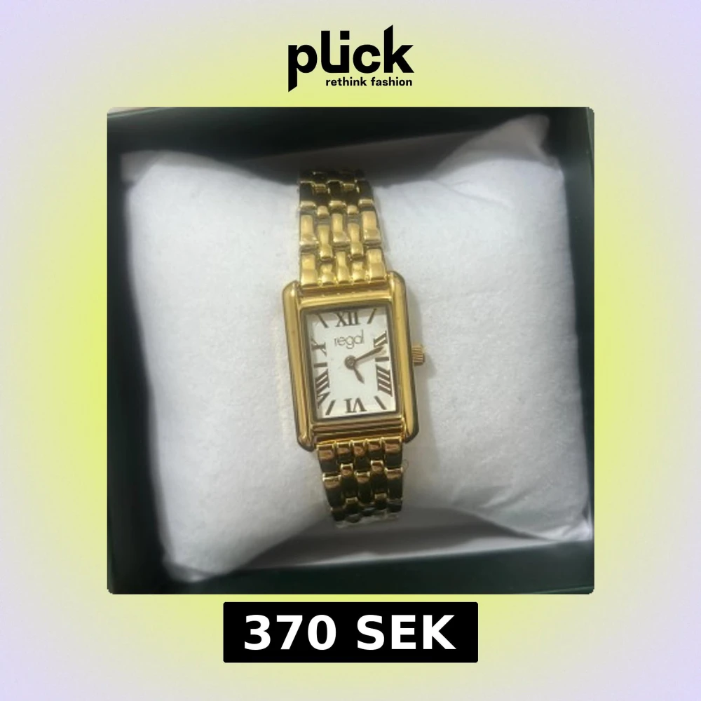Stilren guldfärgad klocka från Regal med rektangulärt ur och vit urtavla. Klockan har romerska siffror och en länkad metallarmband som ger en klassisk vibe. Perfekt accessoar för dig som gillar eleganta detaljer.Aldrig använd fortfarande inplastat