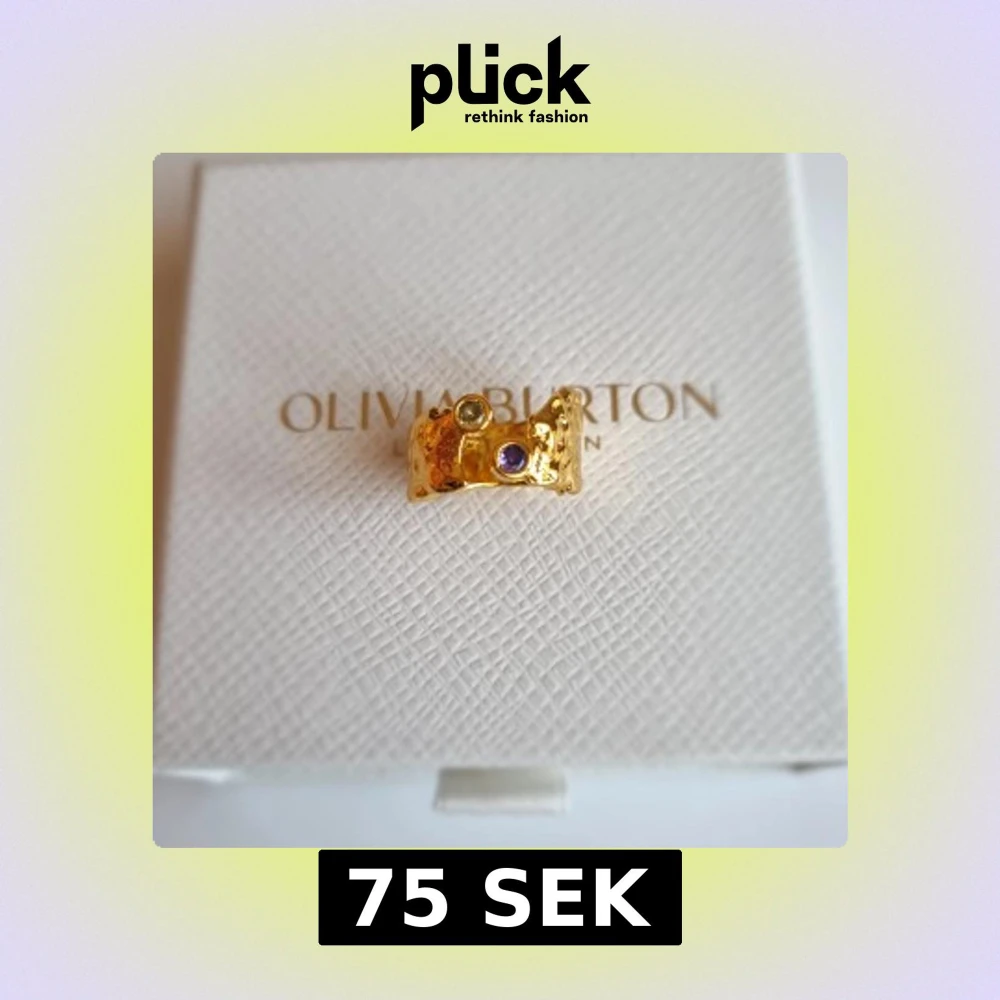Unik bred guldfärgad ring med en rå, hamrad yta och två infattade stenar – en ljus och en lila. Ringen har en modern, chunky design som verkligen sticker ut och ger coola vibes. Lådan ingår ej.