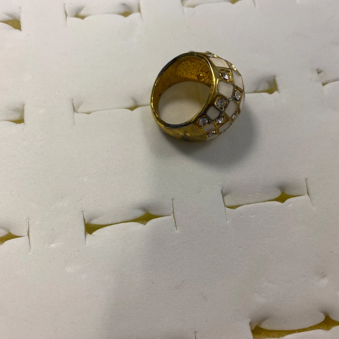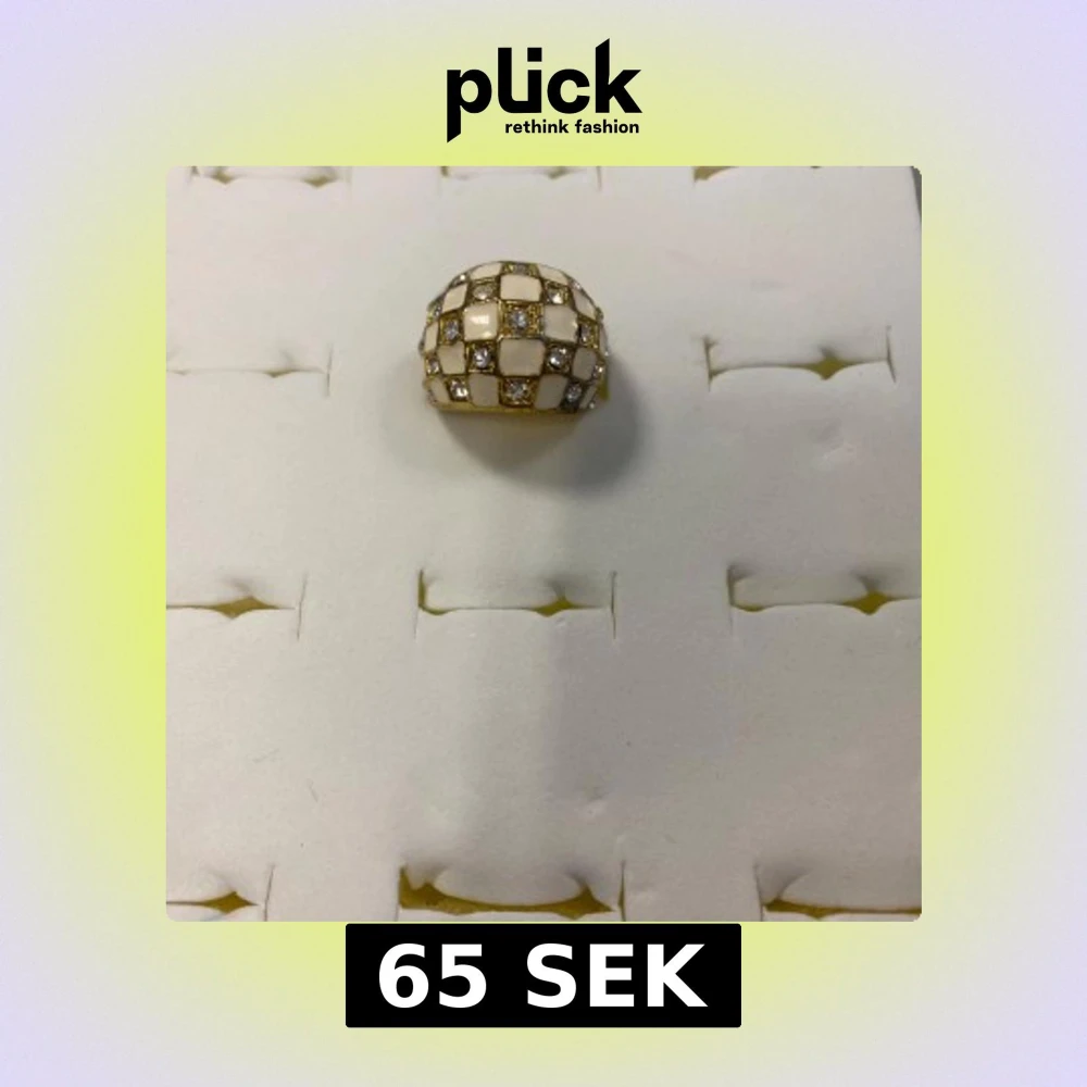 Cool statementring i guldfärg med rutigt mönster i vitt och glittrande stenar. Ringen har en kupad form och ger en riktigt trendig vibe. Perfekt för dig som vill sticka ut med accessoarerna.