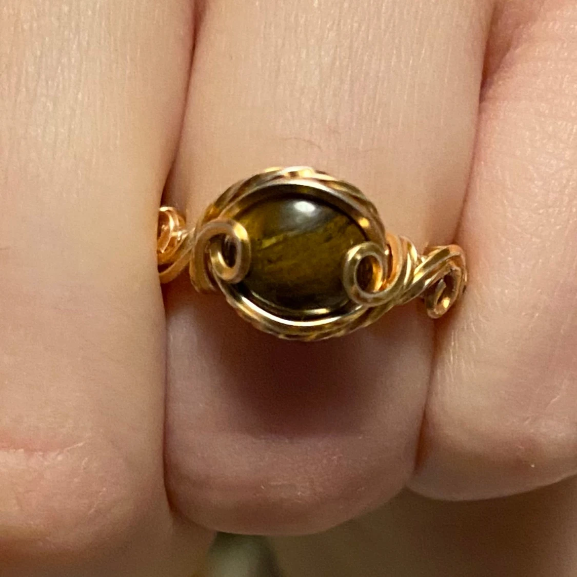 Elegant guldfärgad ring med tigerögasten i mitten. Ringen har en vacker, snirklig design som ger ett unikt och stilrent intryck. Perfekt för att ge en touch av glamour till din look. - Nickelfri - Non-tarnish behandling - Storleksguide på sista bilden
