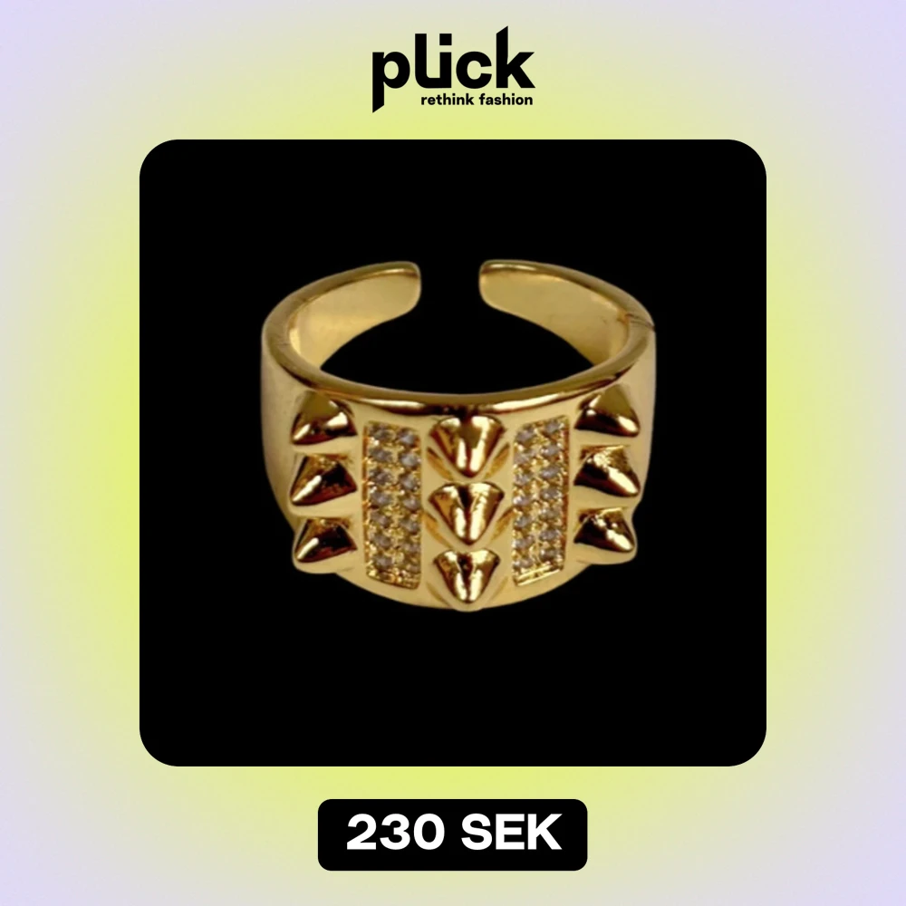Snygg guldfärgad ring med coola strassdetaljer och en öppen design som gör den justerbar. Perfekt för att ge lite edge till din outfit, oavsett om det är till vardags eller fest. Den har en unik design med små pyramidformade detaljer som verkligen sticker ut.