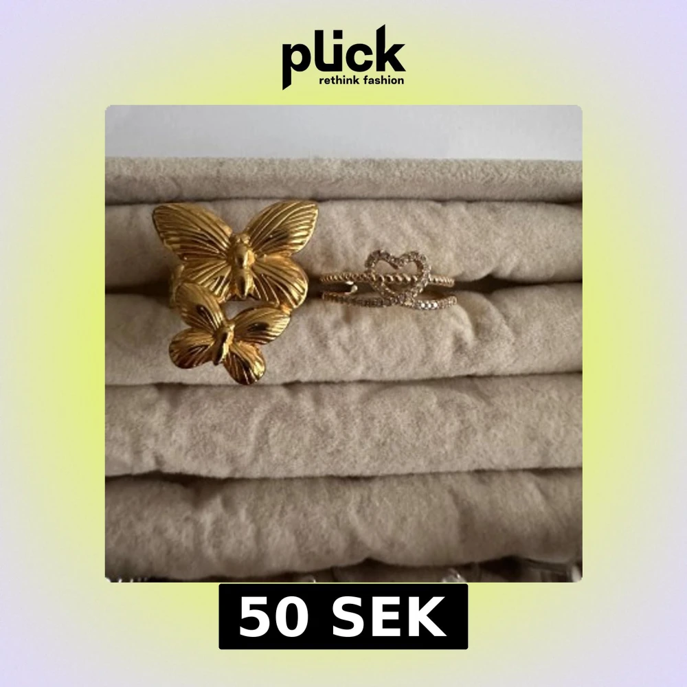 Två vackra guldfärgade ringar med fjärilsdesign. Den ena ringen har två fjärilar i olika storlekar, medan den andra har en elegant hjärtformad detalj med glittriga stenar. Perfekta för att ge en touch av elegans till din stil.