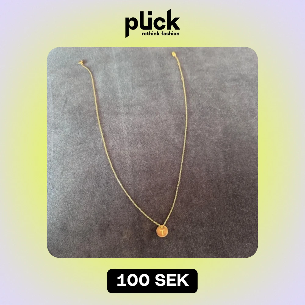 Guldfärgat halsband med bokstavsberlock föreställande bokstaven T. Mycket gott skick. Kedjan går att justera till tre olika längder genom spännet. Längd kedja: 47 cm Diameter berlock: 1 cm