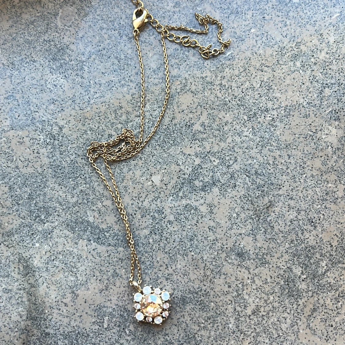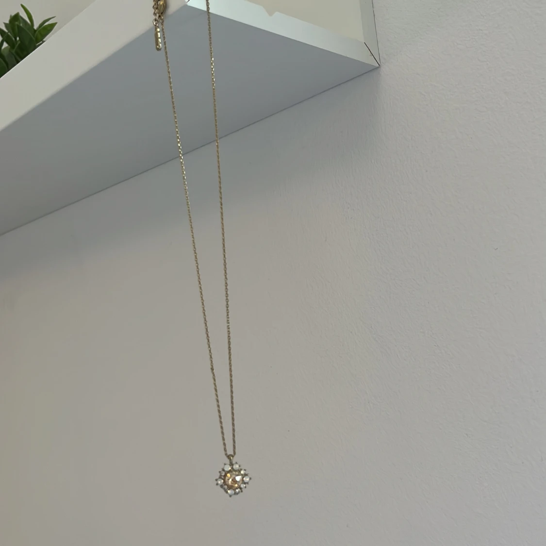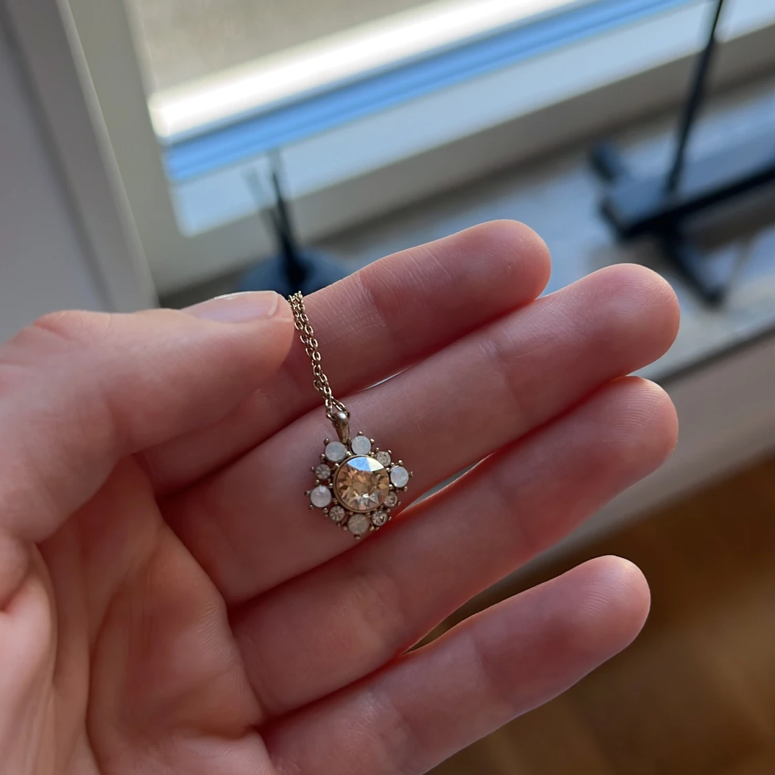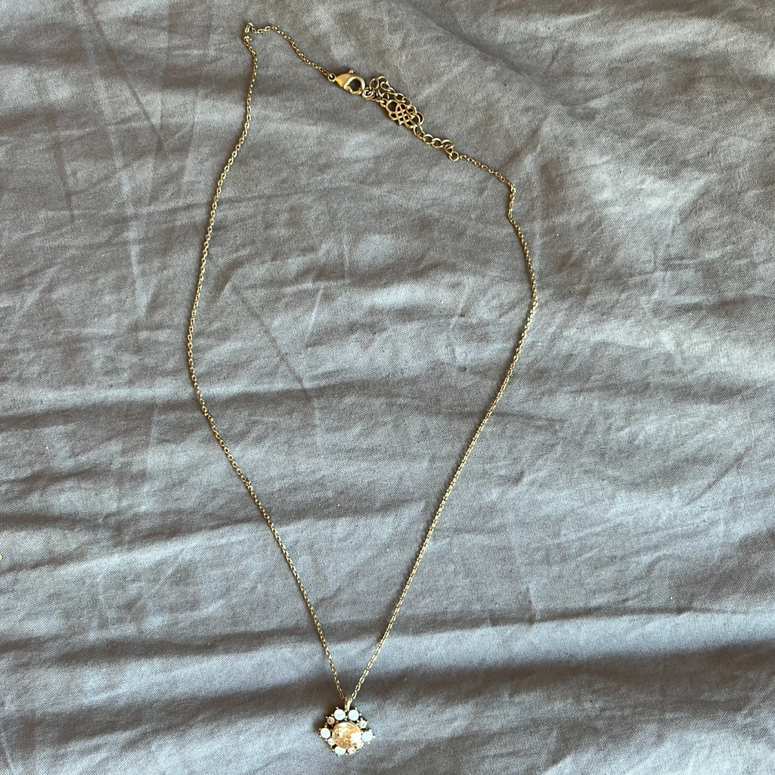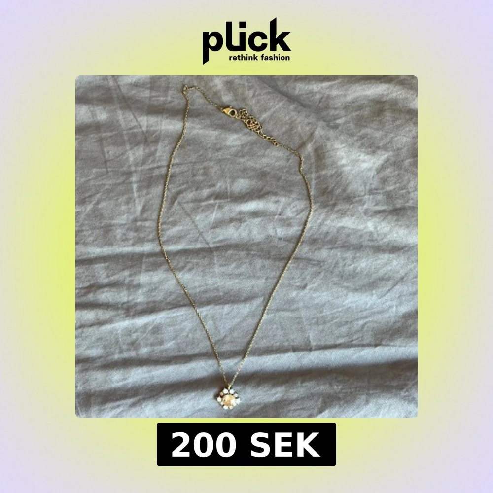 Säljer ett fint guldfärgat halsband med ett blomformat hängsmycke dekorerat med vita och ljusa stenar. Kedjan är tunn och elegant, perfekt för att ge en extra touch till din outfit. Hängsmycket har en vintagekänsla och gnistrar snyggt i ljuset.