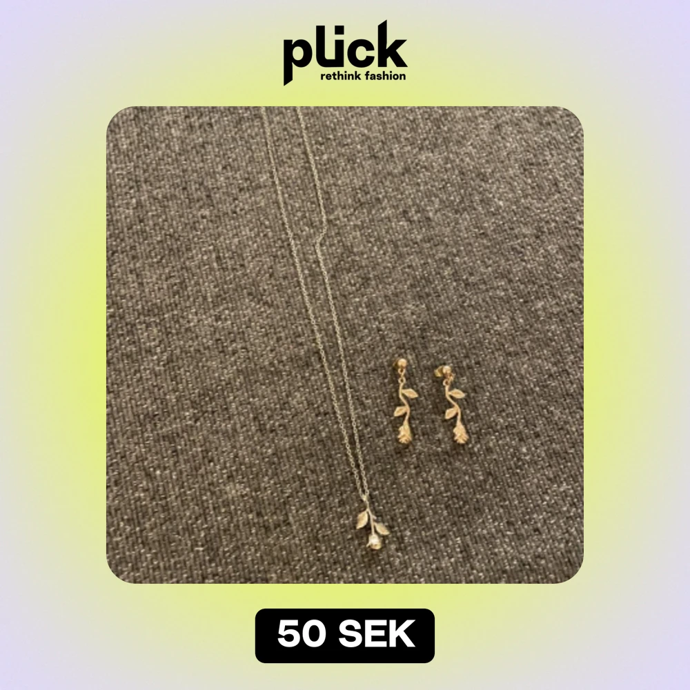 Set med halsband o örhängen. Guldfärgat med hängande rosor