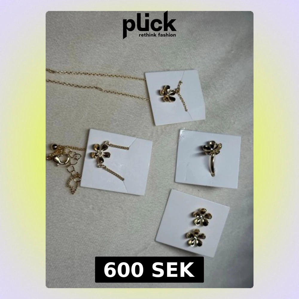 Vackert smyckeset i guldton med blomdetaljer. Setet innehåller halsband, armband, ring och örhängen – allt helt nytt. Perfekt som present eller julklapp. 💰 Nypris: ca 299–349 kr per del (värde ca 1 200 kr totalt).