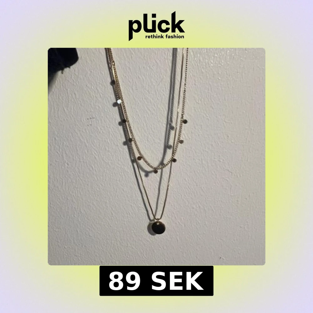 Elegant guldigt halsband med dubbla kedjor och små runda plattor. Det nedre lagret har ett runt hängsmycke som ger en stilren look. Perfekt för att lägga till en touch av elegans till din outfit.