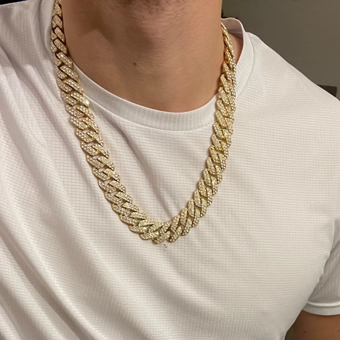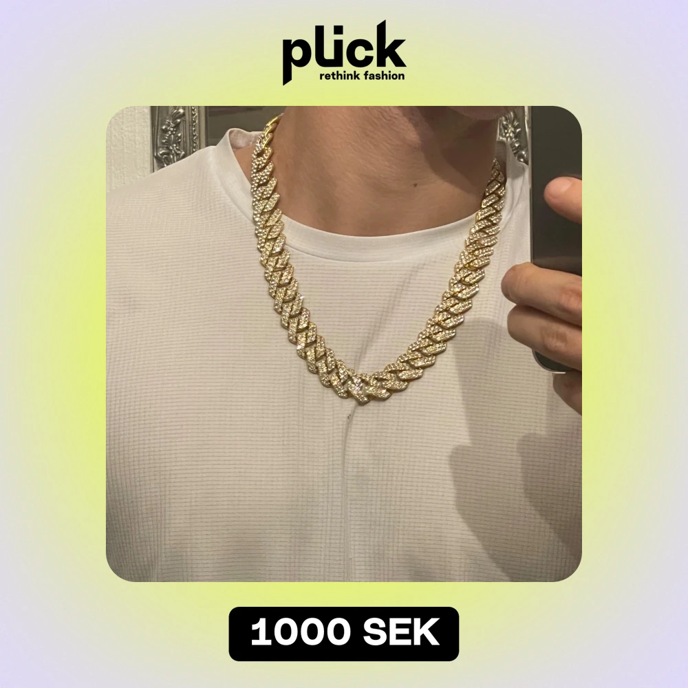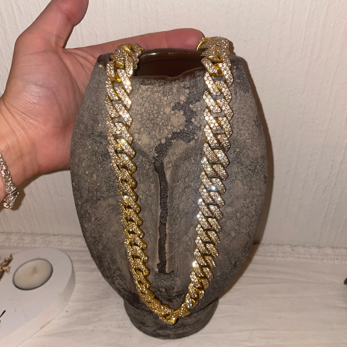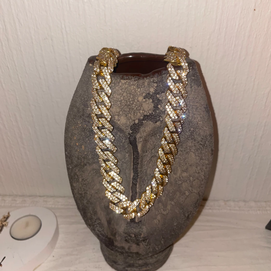 Säljer ett snyggt och glittrigt halsband i guld. Perfekt för att lyfta vilken outfit som helst med lite extra bling. Halsbandet har en chunky design med stora länkar som är täckta av glittrande stenar. Passar perfekt för festliga tillfällen eller när du bara vill känna dig extra glamorös. 🥳✨
