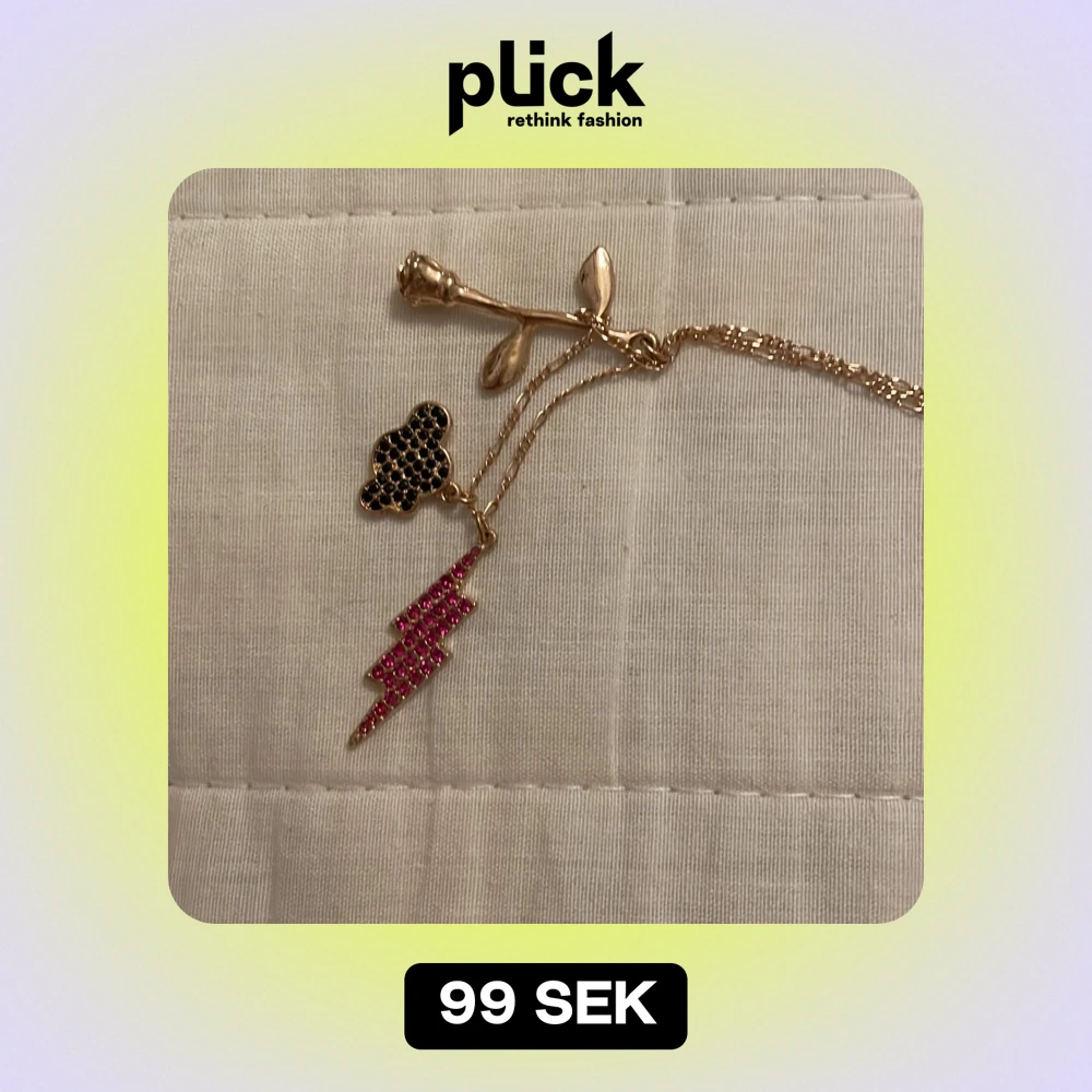 Unikt guldhalsband med tre berlocker: en ros, en svart musformad berlock och en blixt i rosa stenar. Perfekt för att ge en personlig touch till din stil.