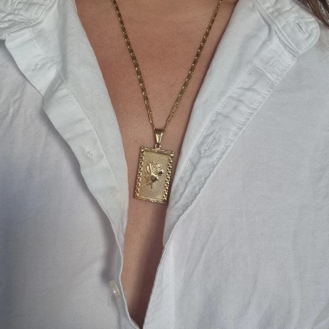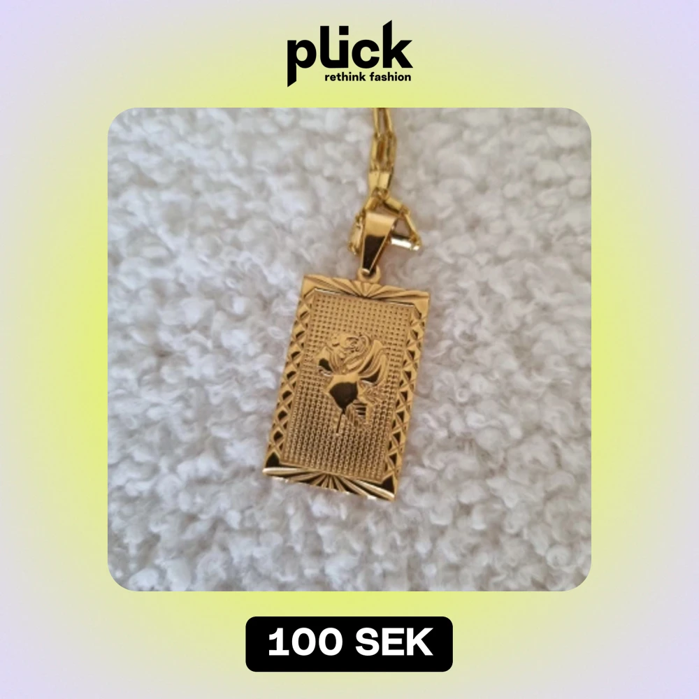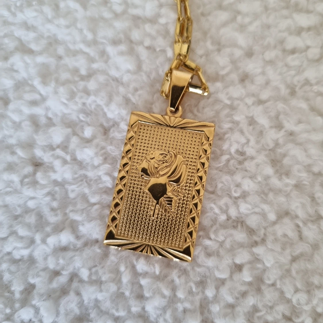 Säljer ett elegant guldhalsband med en rektangulär hängsmycke. Hängsmycket har ett detaljerat mönster med en ros i mitten och en vacker kantdesign. Perfekt för att ge en touch av lyx till din outfit. Passar både till vardags och fest.