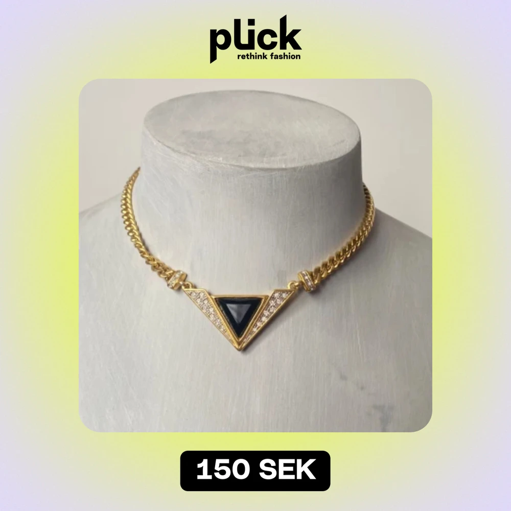 Säljer ett elegant vintage guldhalsband med en cool triangulär svart sten i mitten. Halsbandet har en kedja i guld och är dekorerat med små glittrande stenar runt den svarta triangeln. Perfekt för att ge en lyxig touch till vilken outfit som helst!