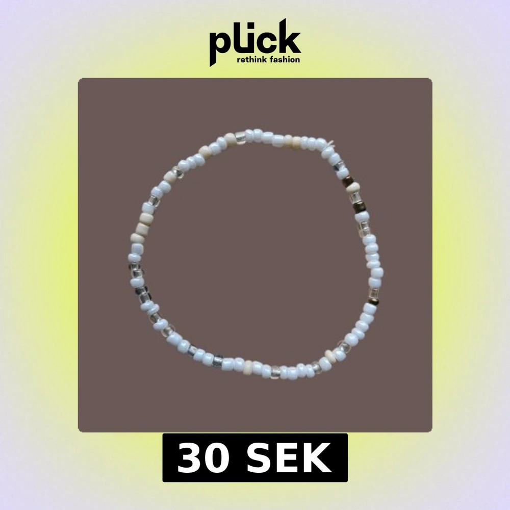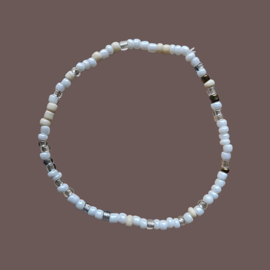 Ett stilrent armband med små pärlor i vitt, beige och silver. Pärlorna är trätt på en elastisk tråd och ger en enkel men trendig look.
