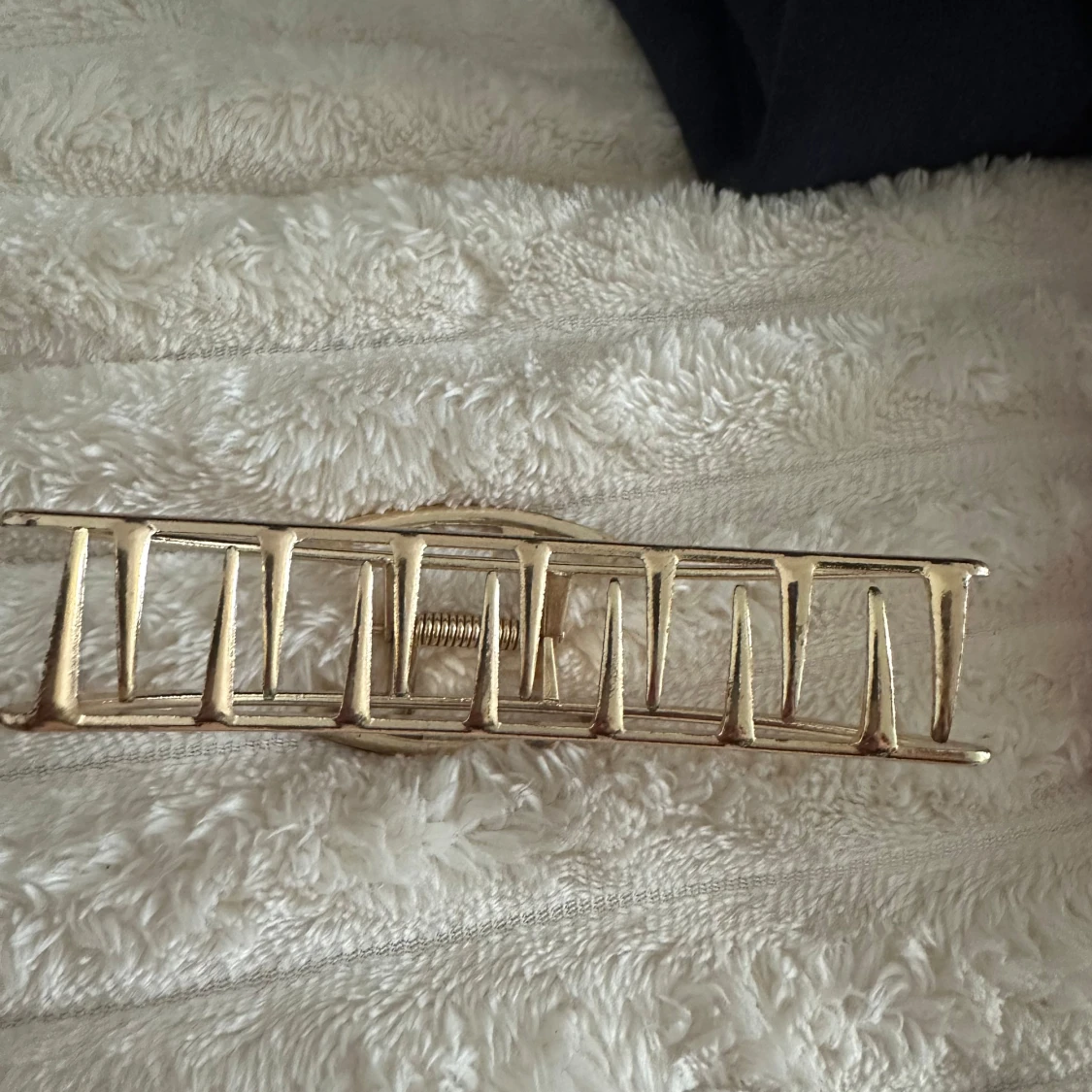 Stilren hårklämma i guldigt metall med öppen design och rejäla taggar som håller håret på plats. Perfekt accessoar för att snabbt fixa en snygg frisyr. Klämman har en bågformad siluett och ger en trendig touch till din look.