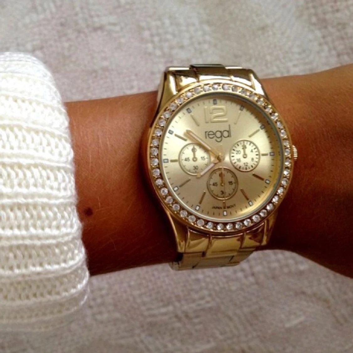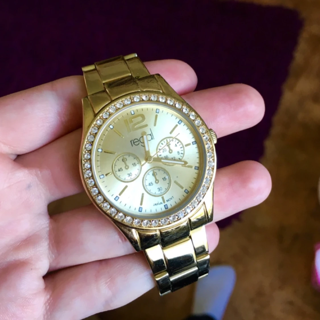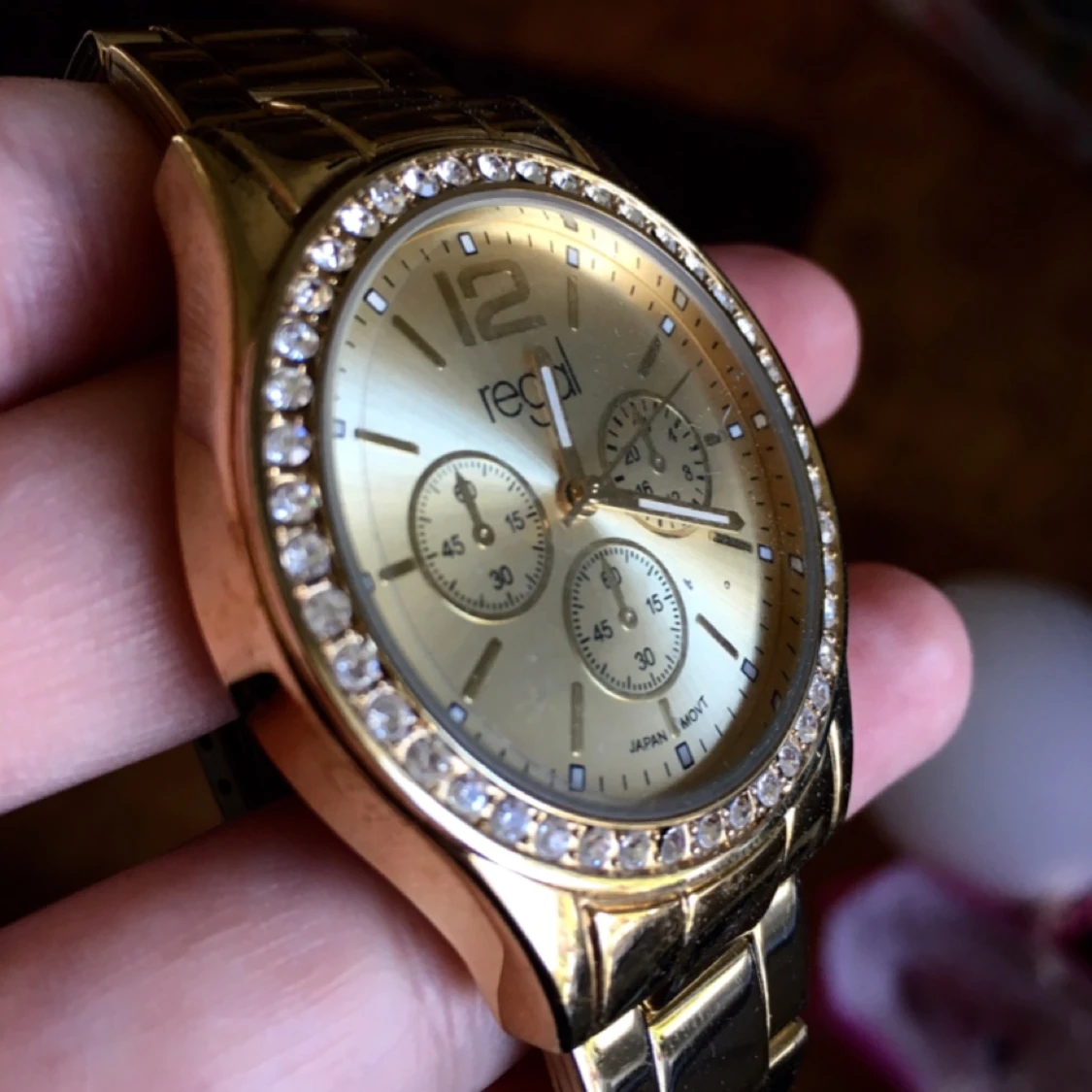 Guldig klocka från märket Regal. "Diamanter" runt urtavlan som dekoration! Behöver nytt batteri.