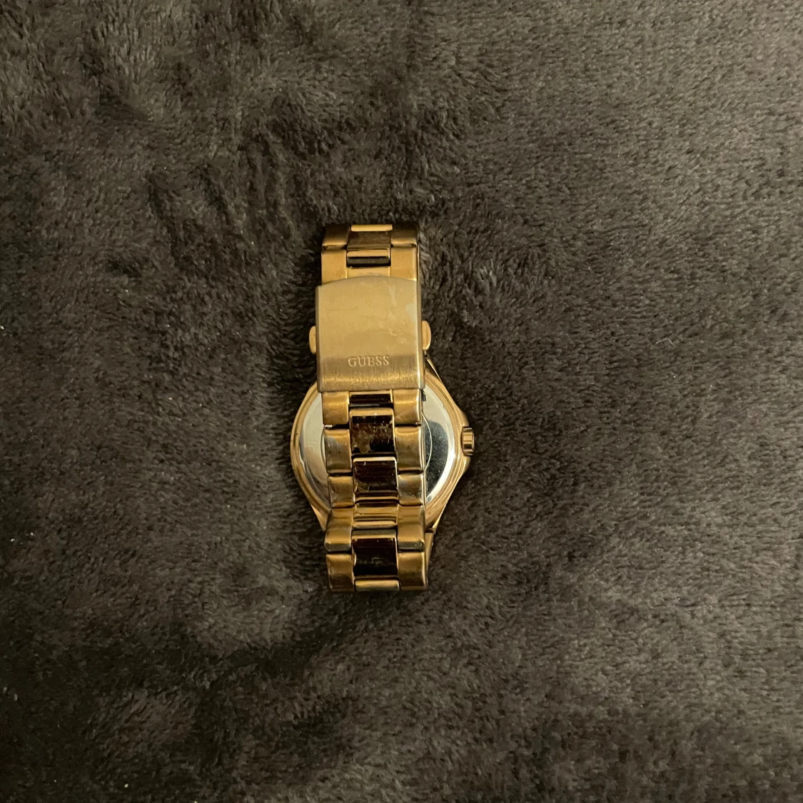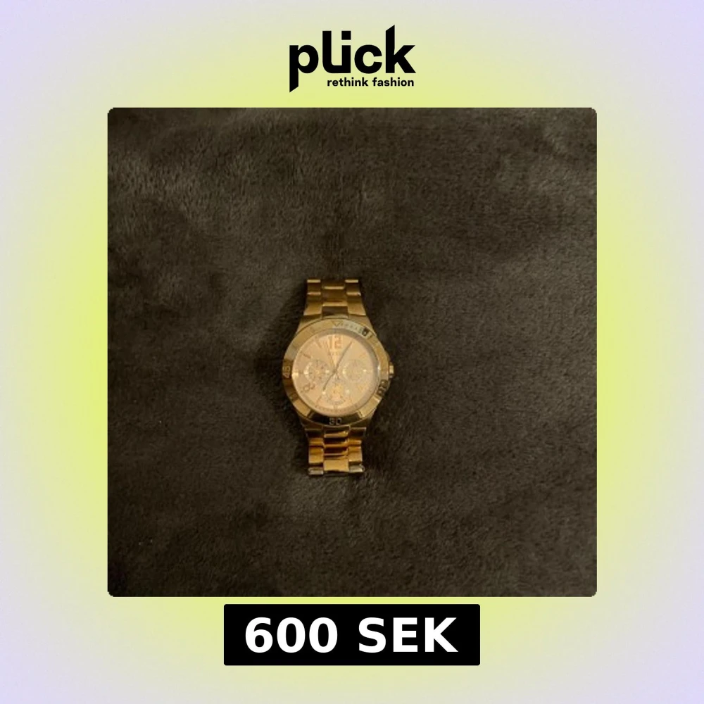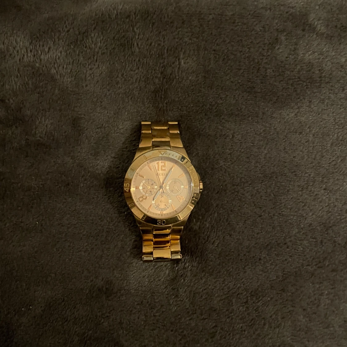 Stilren guldig klocka från Guess med metallarmband och rund urtavla. Klockan har flera små urtavlor och tydliga siffror, perfekt för dig som vill ha en snygg accessoar som sticker ut. Länken är i metall och har ett klassiskt spänne med Guess-logga.