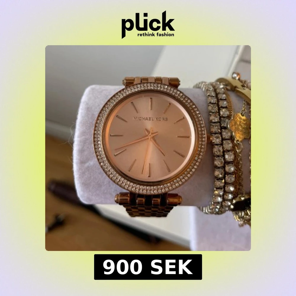 Snygg guldig klocka från Michael Kors med rund urtavla och glittrande stenar runt boetten. Klockan har en länkad metallrem och stilren design med minimalistiska markeringar på urtavlan. Perfekt accessoar för att lyfta din stil.