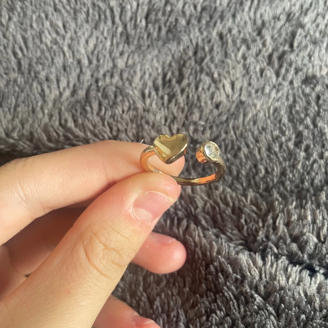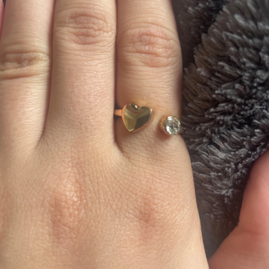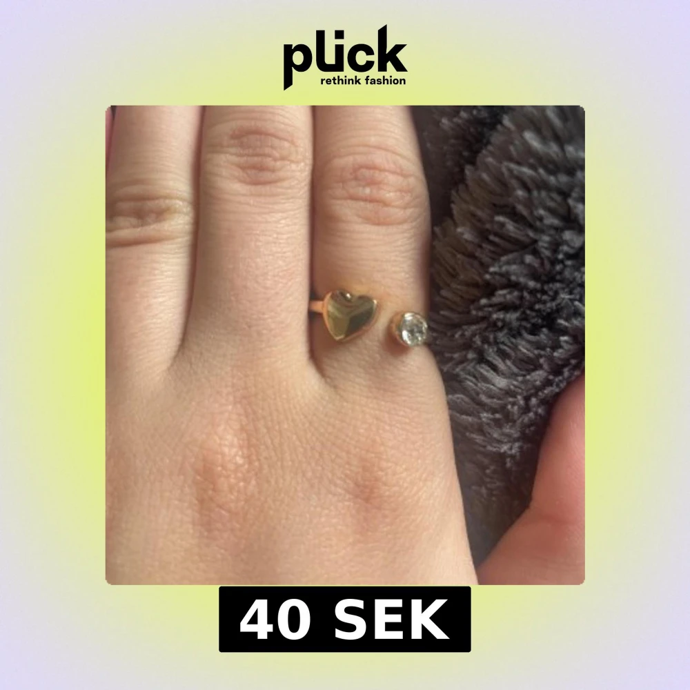 SÀljer en öppen guldig ring med ett hjÀrta pÄ ena sidan och en glittrande sten pÄ andra. Ringen har en enkel men söt design som sticker ut och passar perfekt för dig som gillar detaljer. Perfekt accessoar för att lyfta din stil.
