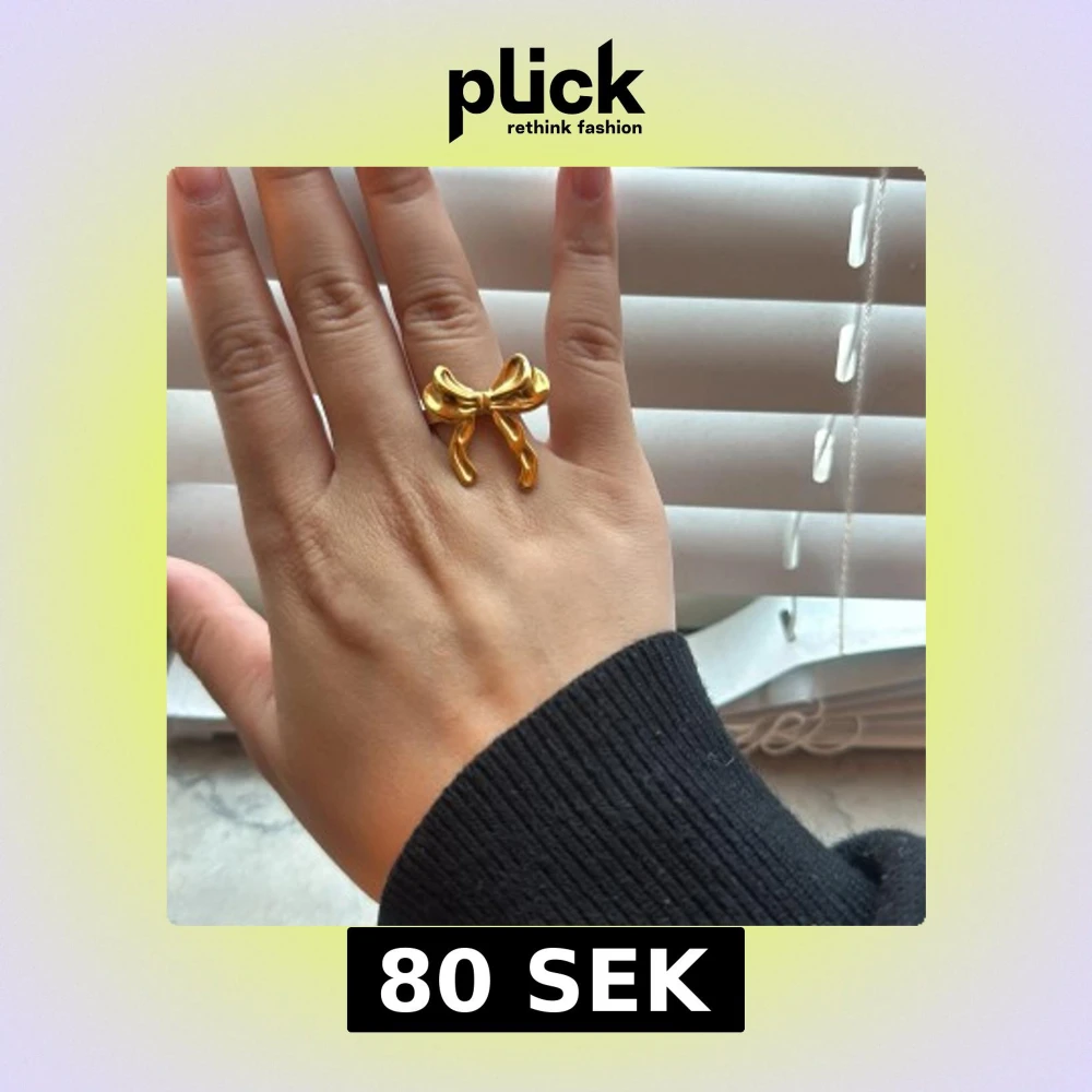 Säljer en snygg och unik ring i guldtonad metall med en stor rosett framtill. Ringen har öppningsbar baksida så den passar flera storlekar. Perfekt för dig som vill sticka ut med en cool accessoar med rolig design Juserbar ring.