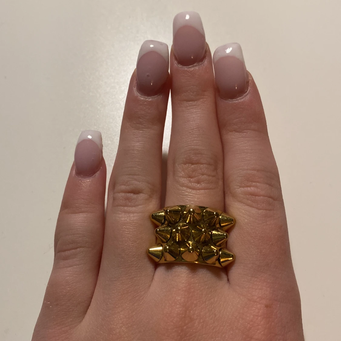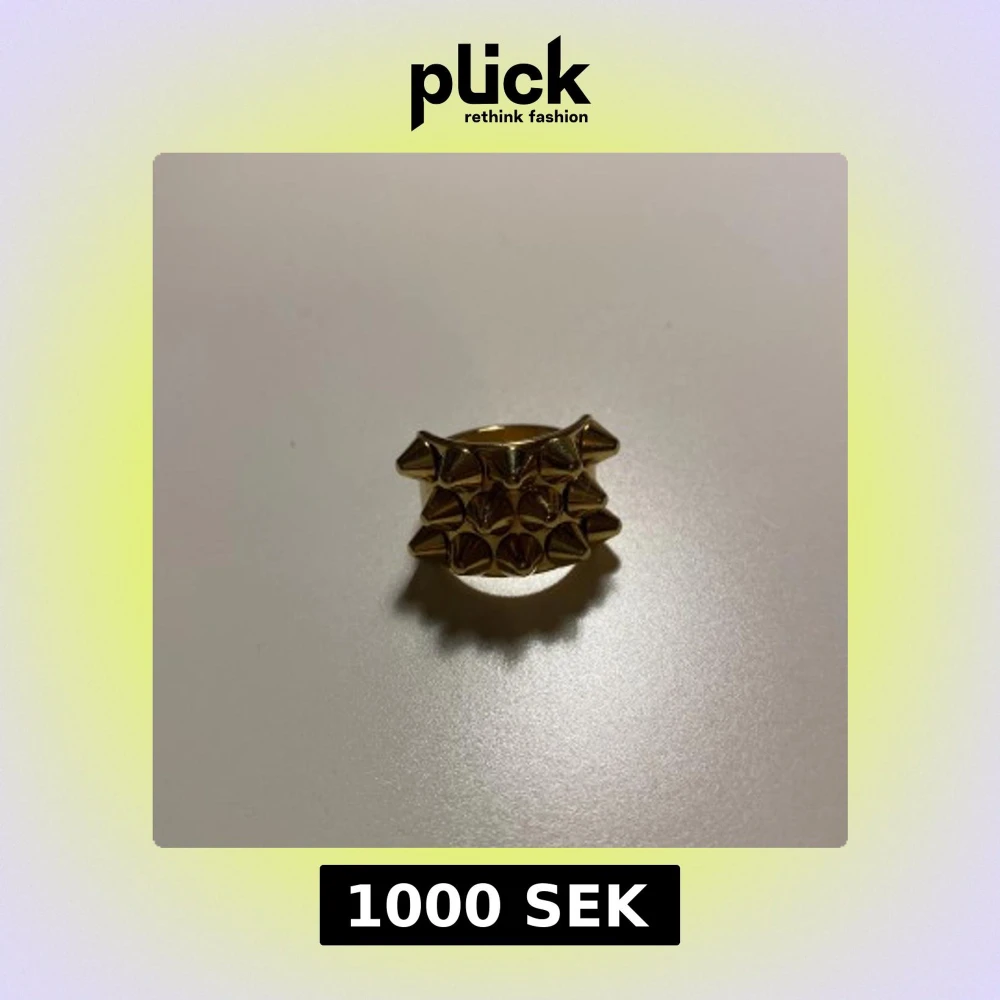 Cool statementring från Edblad i guldtonad metall med flera rader av konformade nitar. Ringen har en bred design som verkligen sticker ut och ger edgy vibes. Perfekt för dig som vill ha något unikt och vågat på fingret.