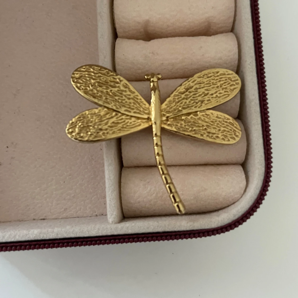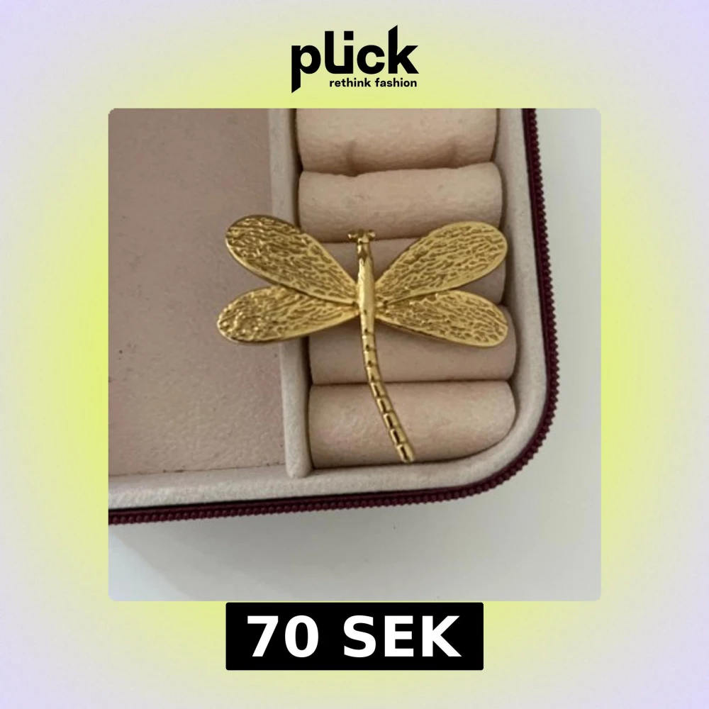 Snygg ring i guldfärgad metall formad som en trollslända med detaljerade vingar. Den har en elegant och naturinspirerad design som sticker ut.