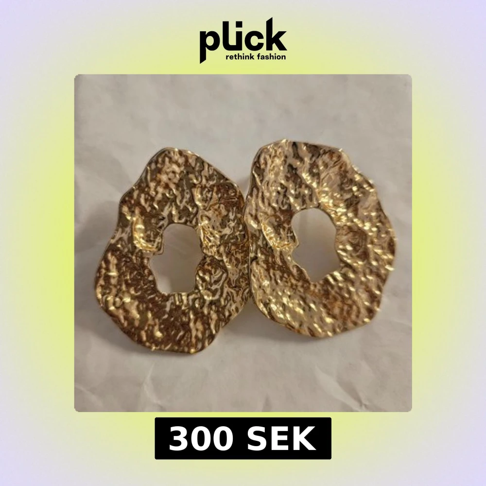 Säljer ett par unika guldiga örhängen med en abstrakt, ojämn form och en glittrig yta. De har en öppen design i mitten och är perfekta för att ge en stilfull touch till din outfit.
