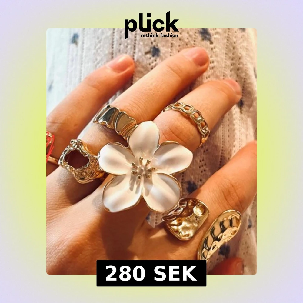 Säljer ett set med fem chunky ringar i guldton. En ring har en stor vit blomma i mitten, de andra har olika former: en med kedjemönster, en med vågig yta och två med organisk, hamrad look. Perfekt för dig som gillar statement-smycken och att mixa stilar.