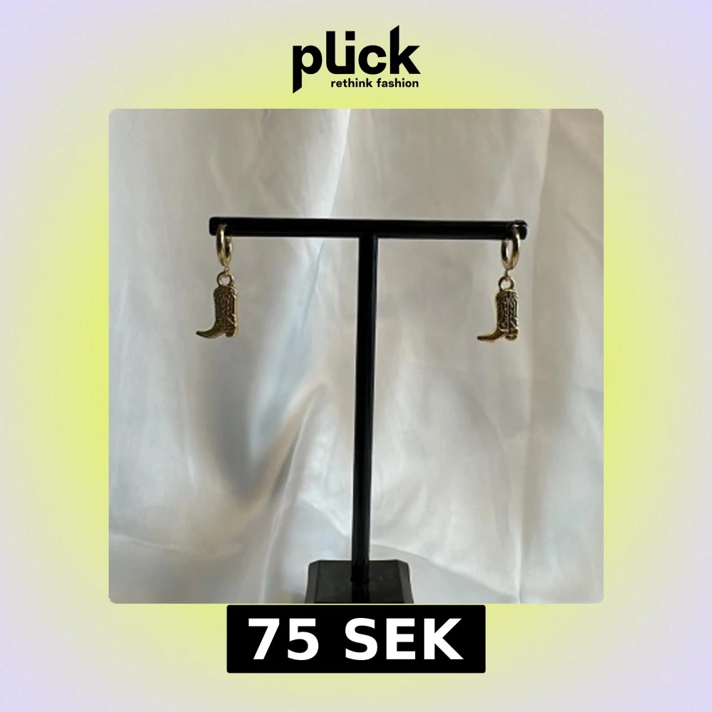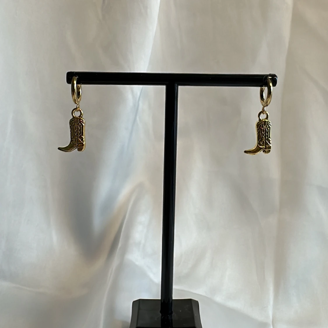 Egentillverkade guldiga örhängen med guldiga berlocker i form av ett par cowboyboots