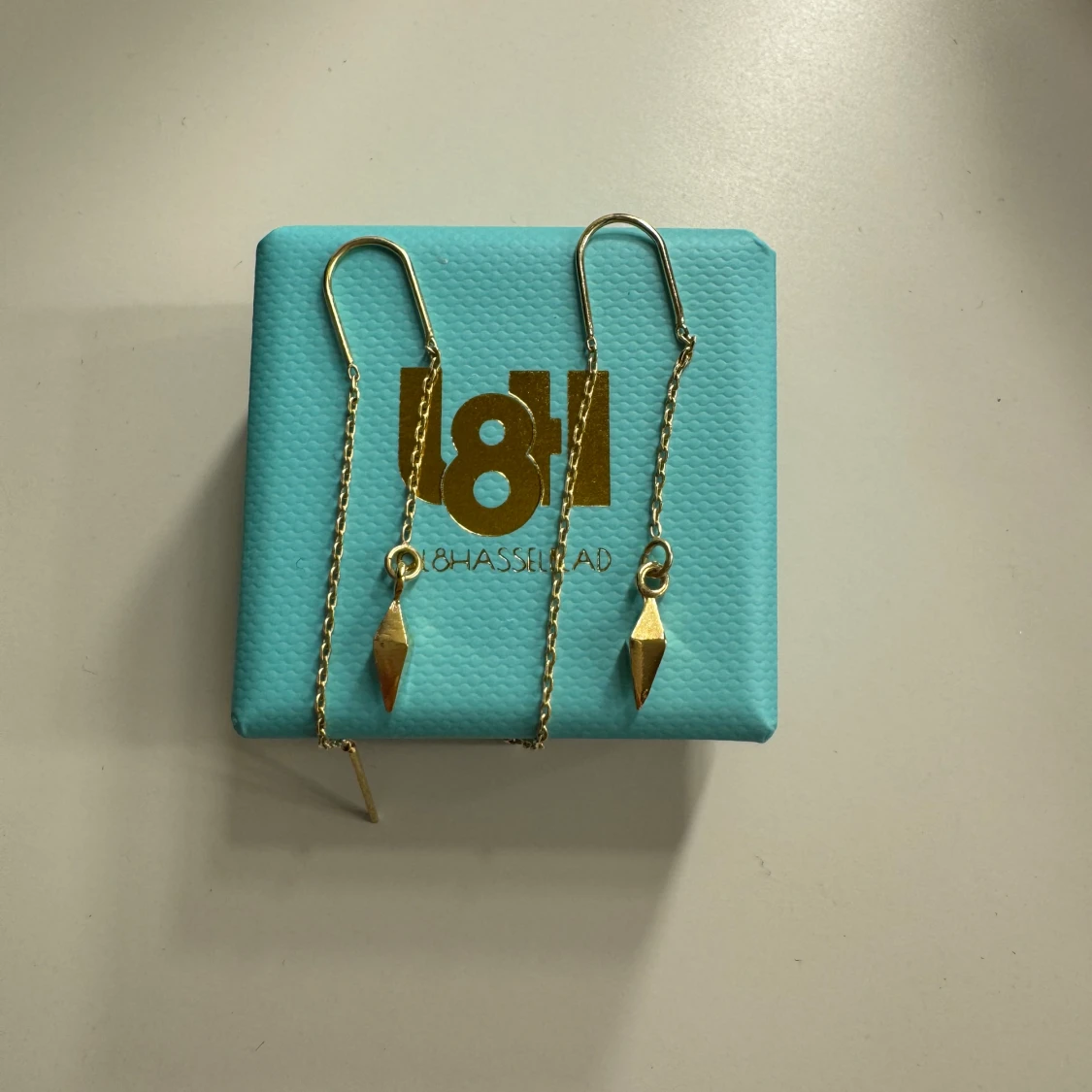 Hängande L8Hasselblad örhängen i guld med nit. Nypris 300kr styck, knappt använda🩷vill man kan man få till påsen och asken