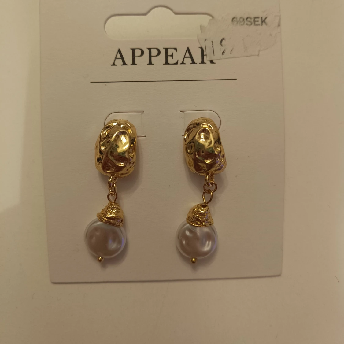 Säljer ett par eleganta örhängen från Appear i guld med hängande vita pärlor. Örhängena är aldrig använd!! Nypris 69, mitt pris 25!!proset kan diskuteras