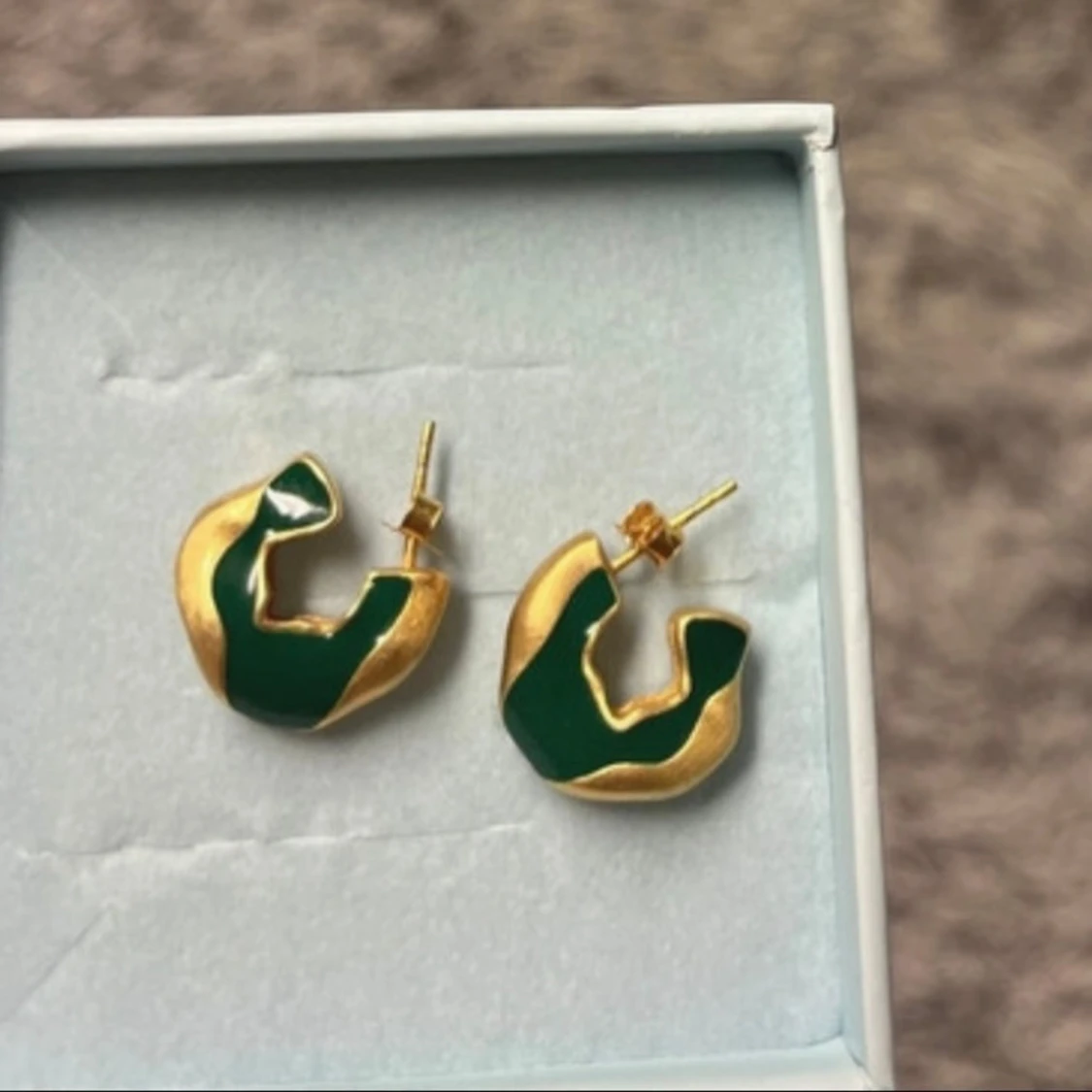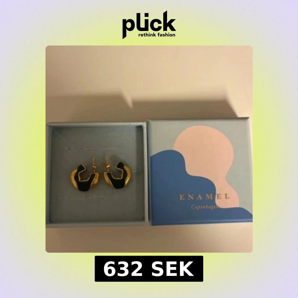 Säljer ett par unika örhängen från Enamel Copenhagen i guld med gröna detaljer. De har en cool, organisk form och är perfekta för att lyfta vilken outfit som helst. Kommer i originalask och aldrig använda.