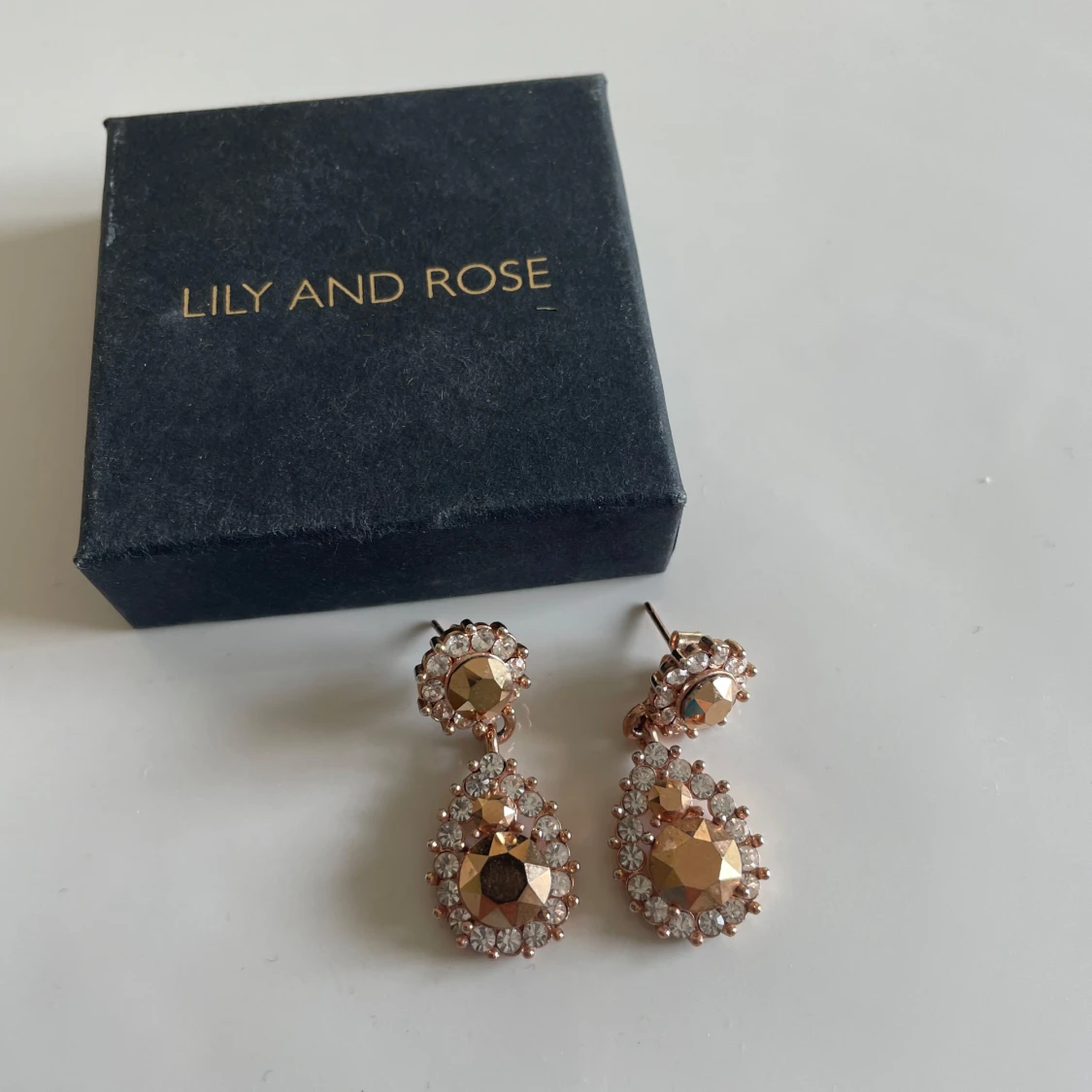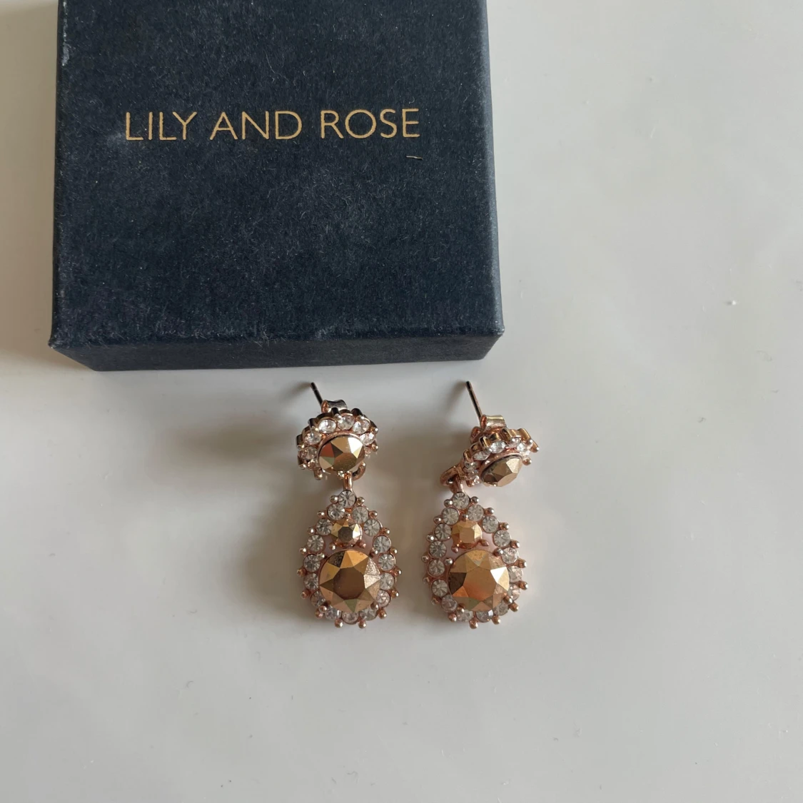 Snygga droppformade örhängen i guldton från Lily and Rose. De har stora facetterade stenar i mitten och är omgivna av små gnistrande kristaller. Perfekta för att ge din look extra glamour och wow-känsla.