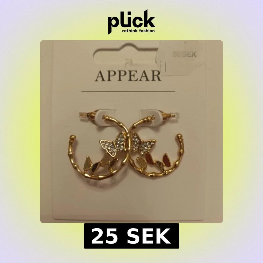 Säljer ett par guldiga örhängen från Appear med dekorativa fjärilar och glittrande stenar. Örhängena har en cirkelform och detaljer i både guld och silverfärg. Perfekt accessoar för att lyfta din stil. Supersnygga men kommer inte komma till användning. Helt Nya och aldrig använda!!! Nypris 59kr, mitt pris 25. Priset kan diskuteras