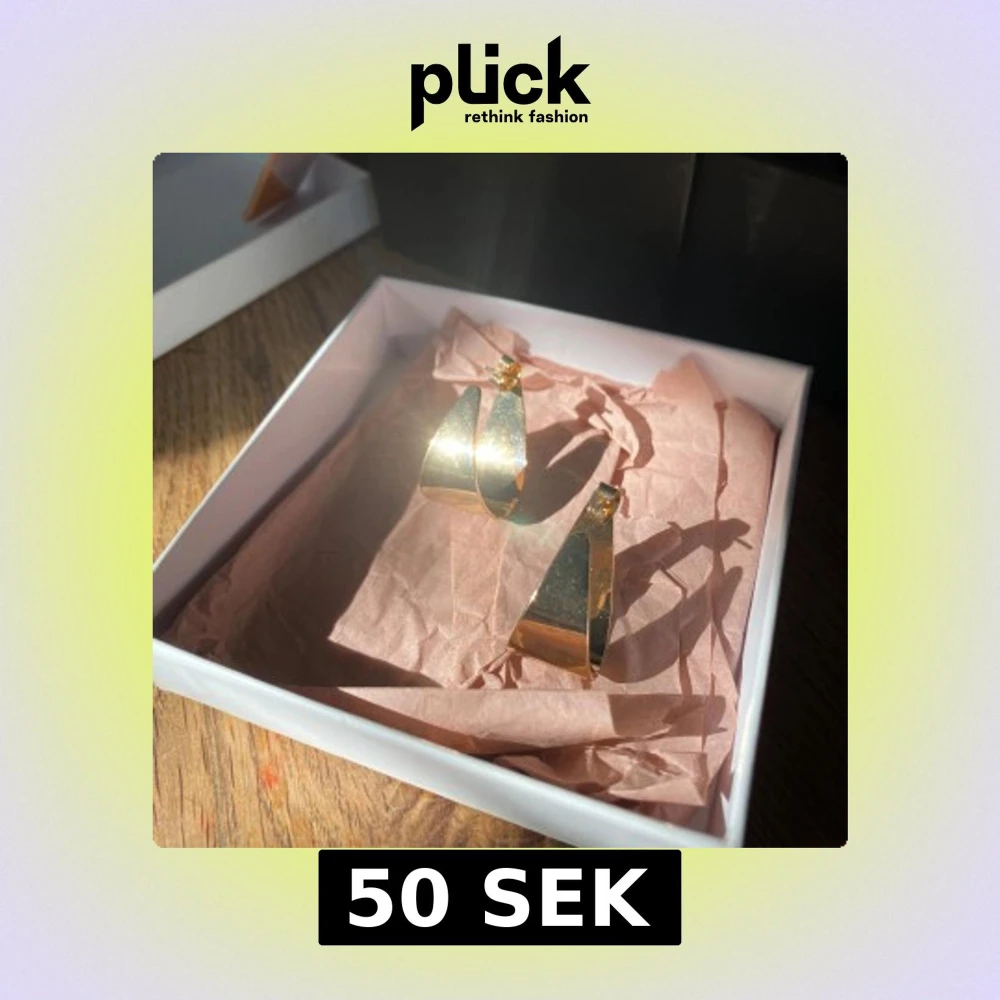 Säljer ett par coola guldiga hoops med bred, snirklig form. De har en modern och unik design som verkligen sticker ut. Perfekta för dig som vill ha något extra till din stil. Ej använda av mig, ifrån H&M