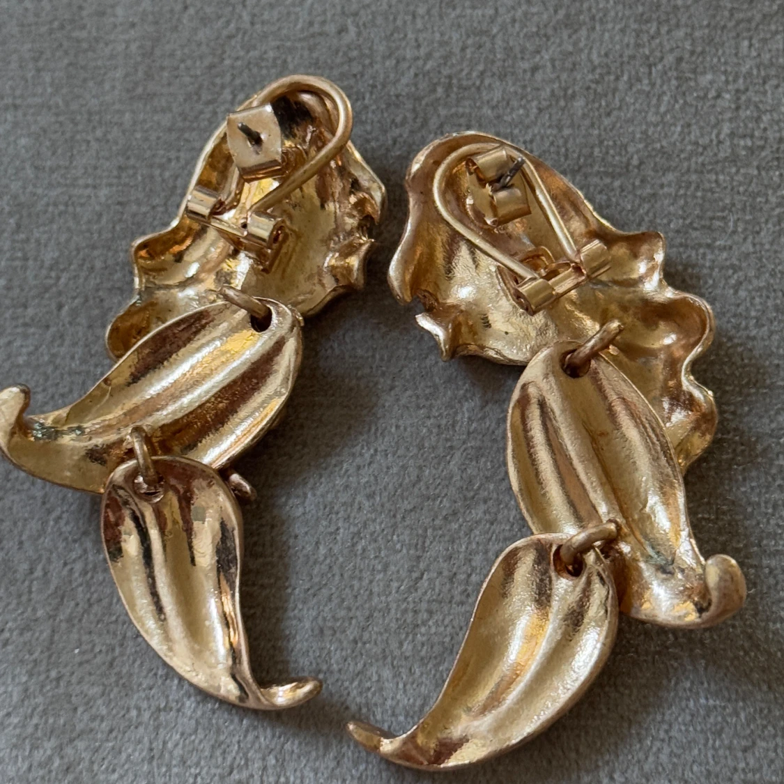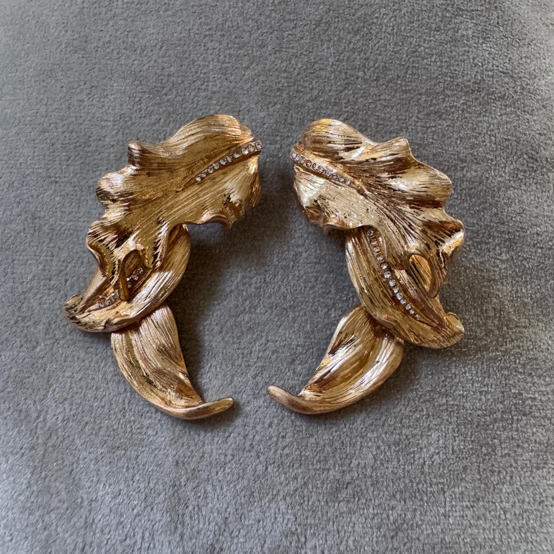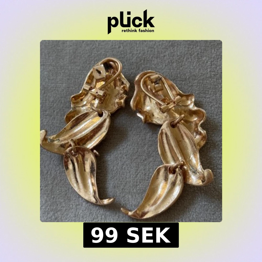 Unika örhängen i guldtonad metall med coola, organiska bladformer och små glittriga stenar längs ena kanten. De har en snygg vintagevibe och är perfekta för att sticka ut. Klämfäste för enkel användning.