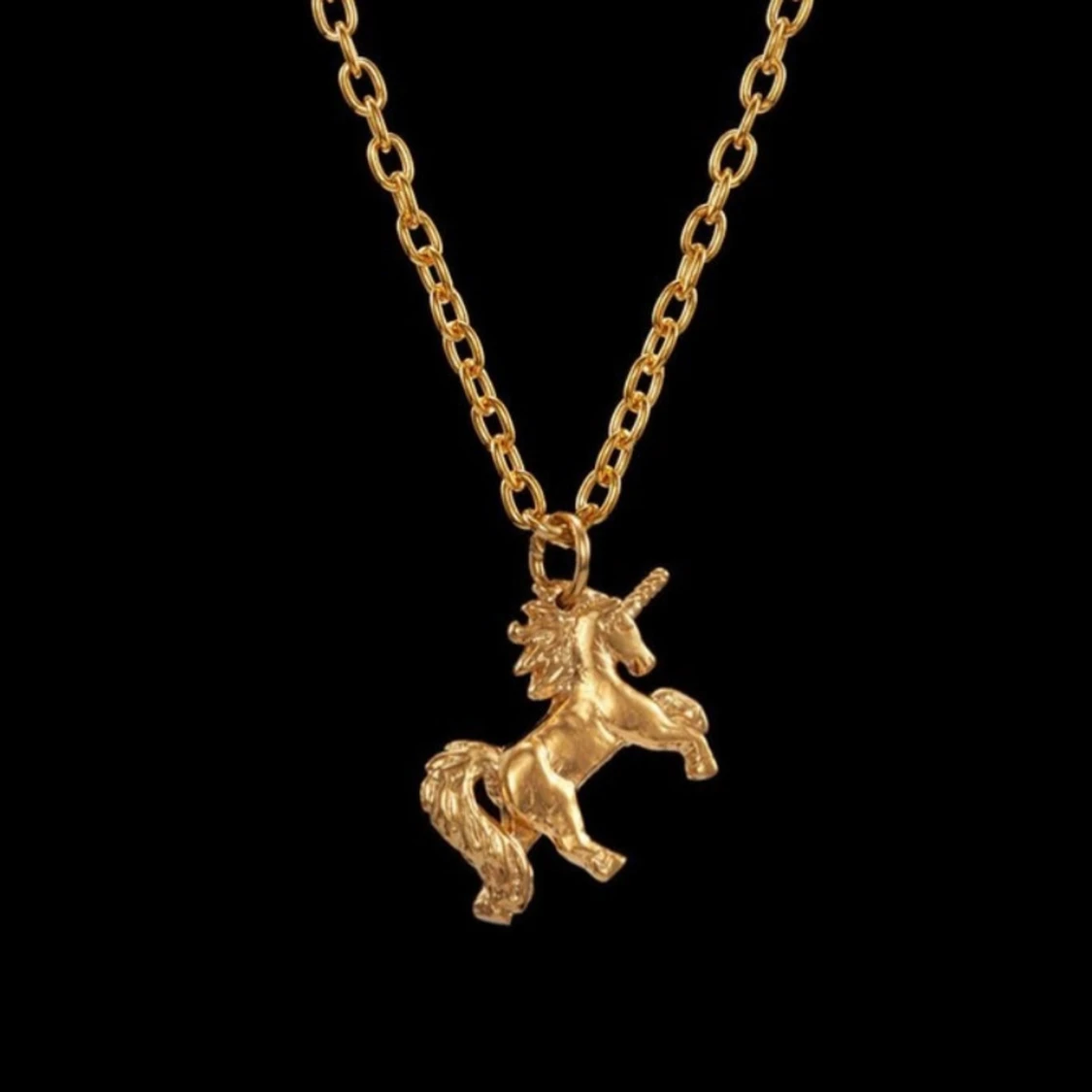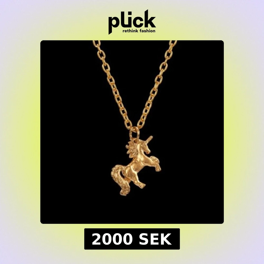 Unikt halsband i guldton med en detaljerad enhörning som hänge från Maria Nilsdotter. Enhörningen är tredimensionell med tydlig man och svans. Ok använt skick, dm för fler bilder på vanlig kamera. Nypris 2695:-
