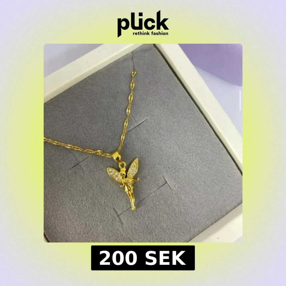 Unikt halsband i guldton med en söt fe-berlock. Feen har gnistrande vingar med små klara stenar som ger extra bling. Kedjan är tunn och har ett coolt länk-mönster. Ej använd utan kommer från min small business.